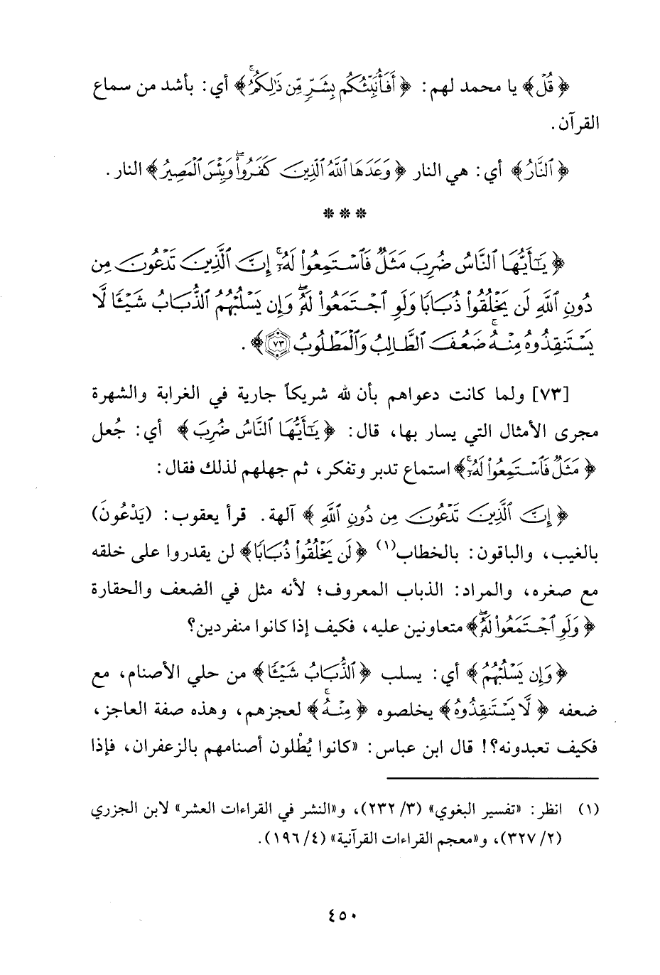 {إِنَّ الَّذِينَ تَدْعُونَ مِنْ دُونِ اللَّهِ} آلهة. قرأ يعقوب: (يَدْعُونَ) بالغيب، والباقون: بالخطاب (¬1) {لَنْ يَخْلُقُوا ذُبَابًا} لن يقدروا على خلقه مع صغره، والمراد: الذباب المعروف؛ لأنه مثل في الضعف والحقارة {وَلَوِ اجْتَمَعُوا لَهُ} متعاونين عليه، فكيف إذا كانوا منفردين؟