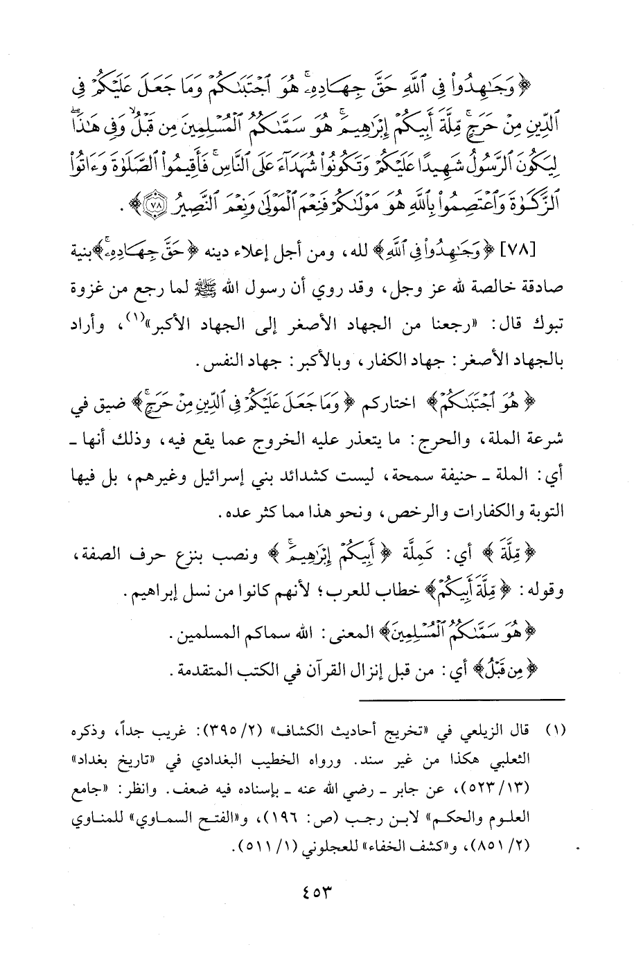 [78] {وَجَاهِدُوا فِي اللَّهِ} لله، ومن أجل إعلاء دينه {حَقَّ جِهَادِهِ} بنية صادقة خالصة لله عز وجل، وقد روي أن رسول الله - صلى الله عليه وسلم - لما رجع من غزوة تبوك قال: "رجعنا من الجهاد الأصغر إلى الجهاد الأكبر" (¬1)، وأراد بالجهاد الأصغر: جهاد الكفار، وبالأكبر: جهاد النفس.