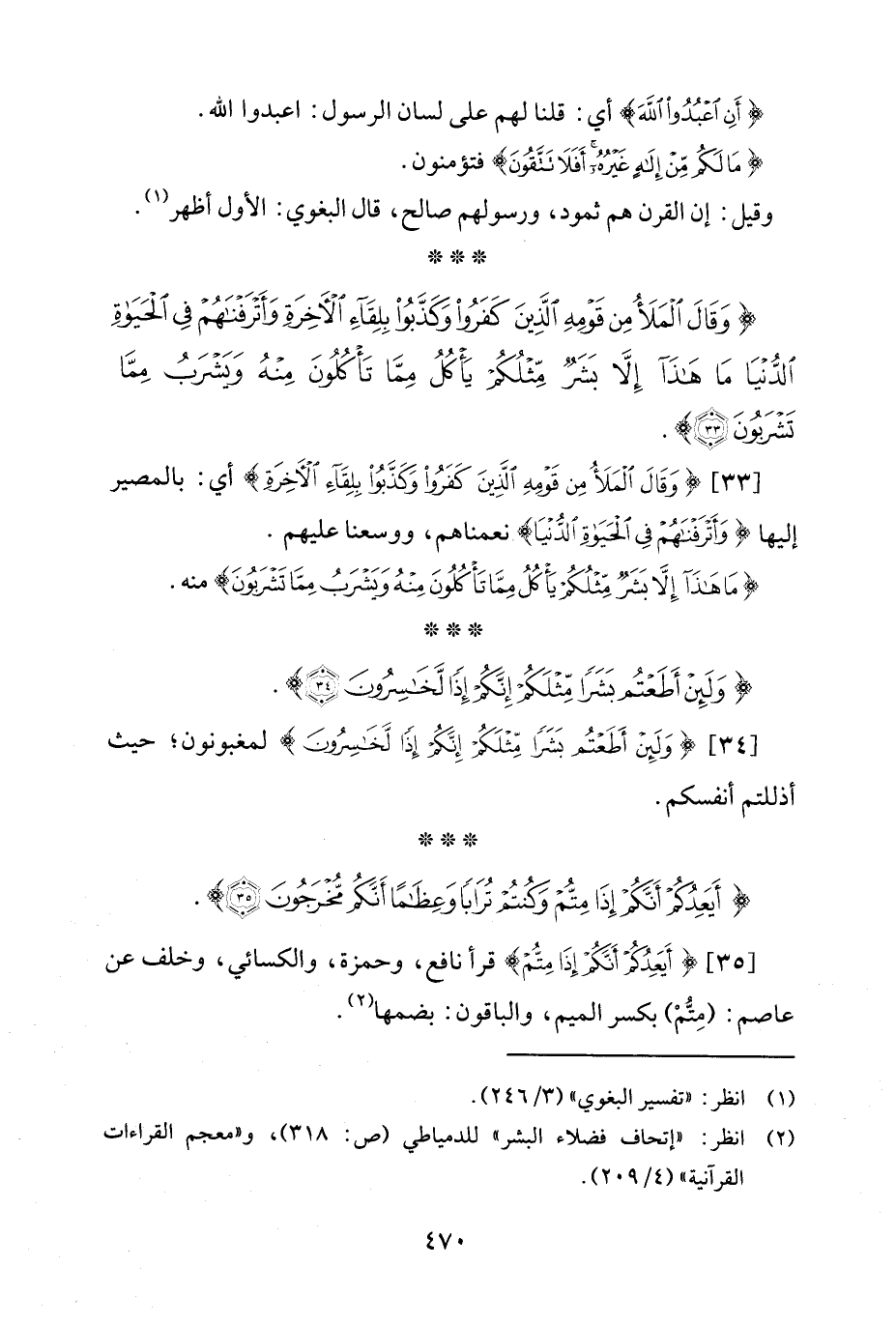 [35] {أَيَعِدُكُمْ أَنَّكُمْ إِذَا مِتُّمْ} قرأ نافع، وحمزة، والكسائي، وخلف عن عاصم: (مِتُّمْ) بكسر الميم، والباقون: بضمها (¬2).