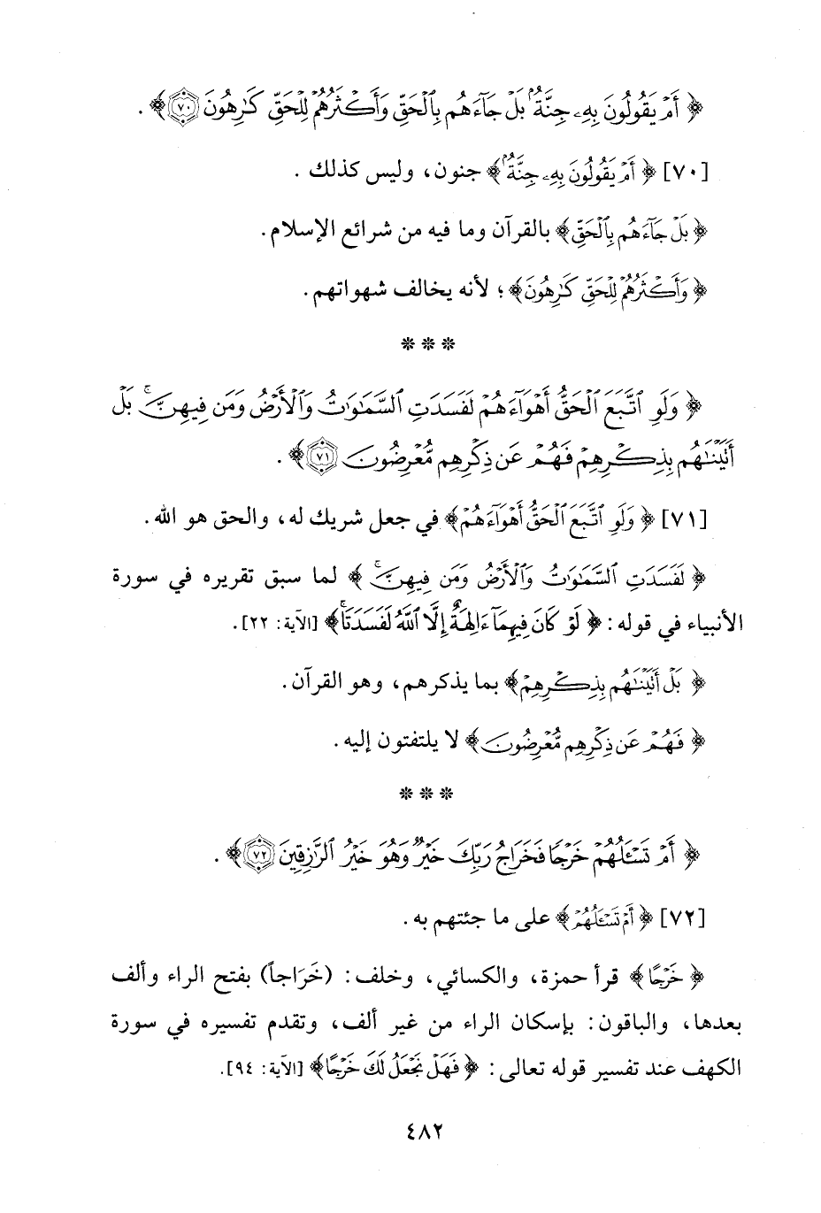 {خَرْجًا} قرأ حمزة، والكسائي، وخلف: (خَرَاجًا) بفتح الراء وألف بعدها، والباقون: بإسكان الراء من غير ألف، وتقدم تفسيره في سورة الكهف عند تفسير قوله تعالى: {فَهَلْ نَجْعَلُ لَكَ خَرْجًا} [الآية: 94].