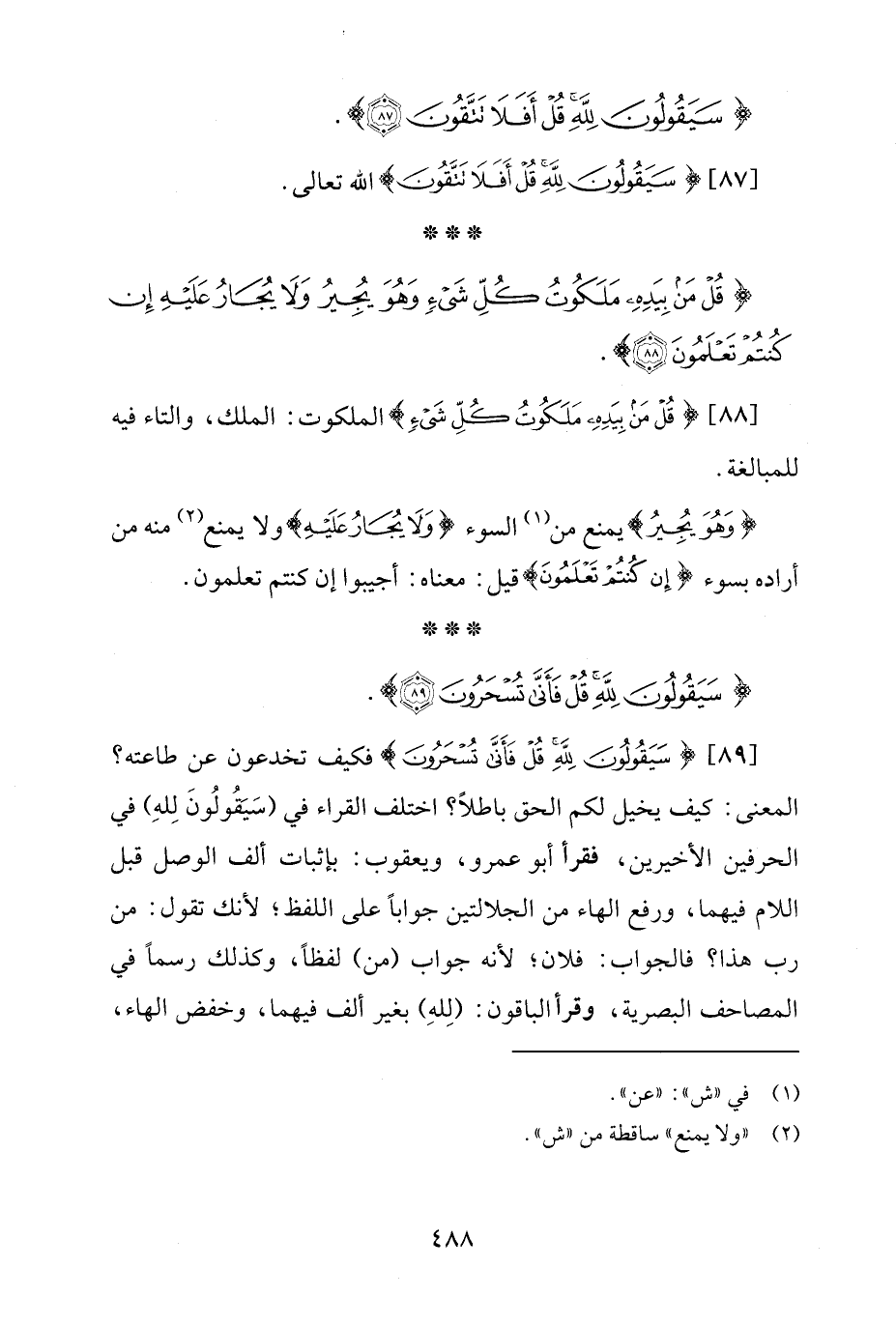 [88] {قُلْ مَنْ بِيَدِهِ مَلَكُوتُ كُلِّ شَيْءٍ} الملكوت: الملك، والتاء فيه للمبالغة.