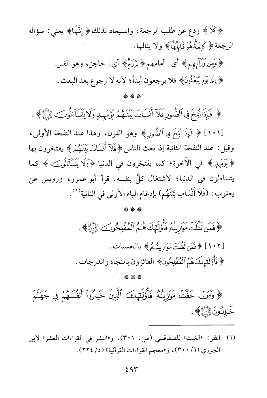 [101] {فَإِذَا نُفِخَ فِي الصُّورِ} وهو القرن، وهذا عند النفخة الأولى، وقيل: عند النفخة الثانية إذا بعث الناس {فَلَا أَنْسَابَ بَيْنَهُمْ} يفتخرون بها {يَوْمَئِذٍ} في الآخرة؛ كما يفتخرون في الدنيا {وَلَا يَتَسَاءَلُونَ} كما يتساءلون في الدنيا؛ لاشتغال كلٍّ بنفسه. قرأ أبو عمرو، ورويس عن يعقوب: (فَلاَ أَنْسَاب بَّيْنَهُمْ) بإدغام الباء الأولى في الثانية (¬1).