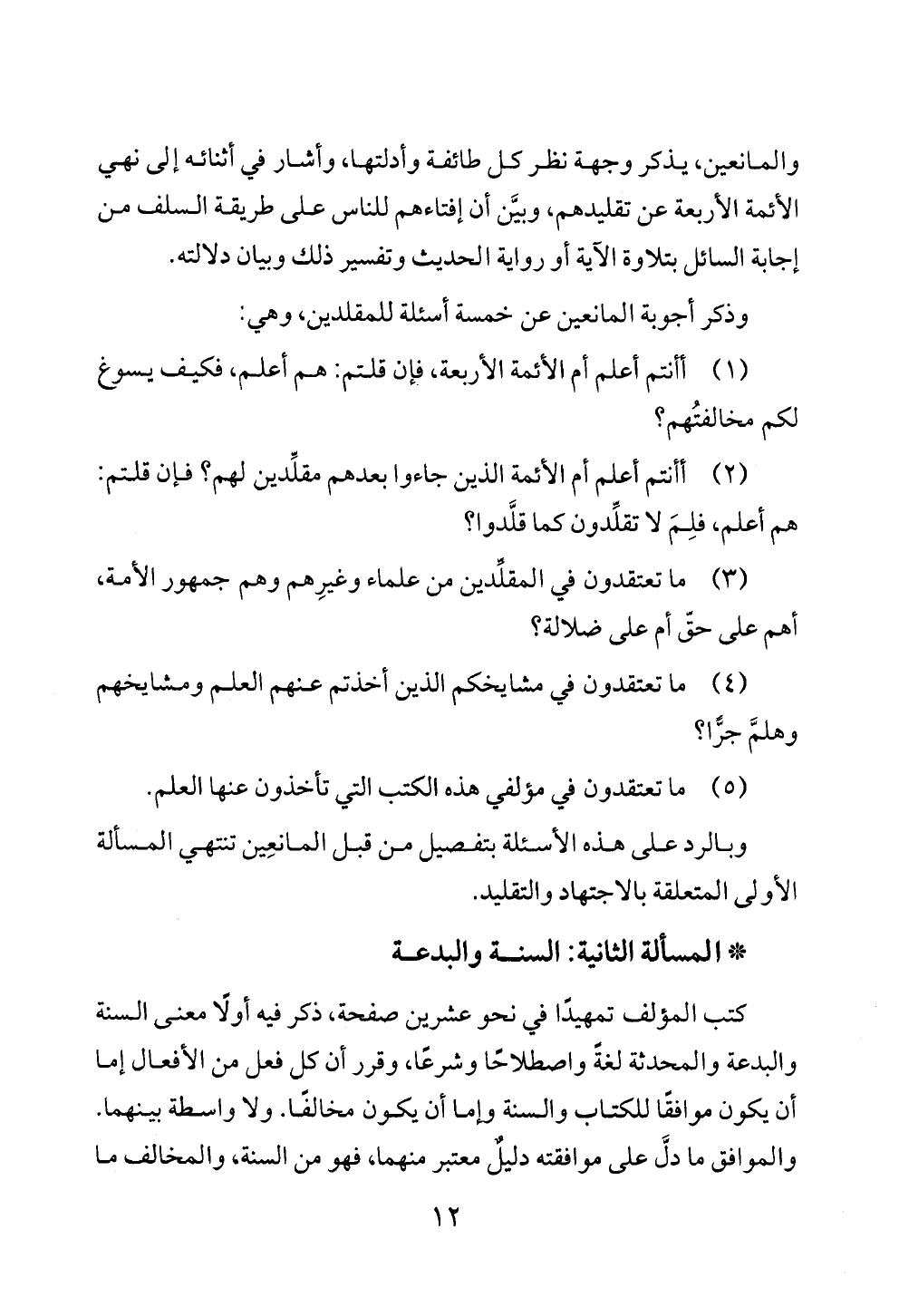 وذكر أجوبة المانعين عن خمسة أسئلة للمقلدين، وهي: