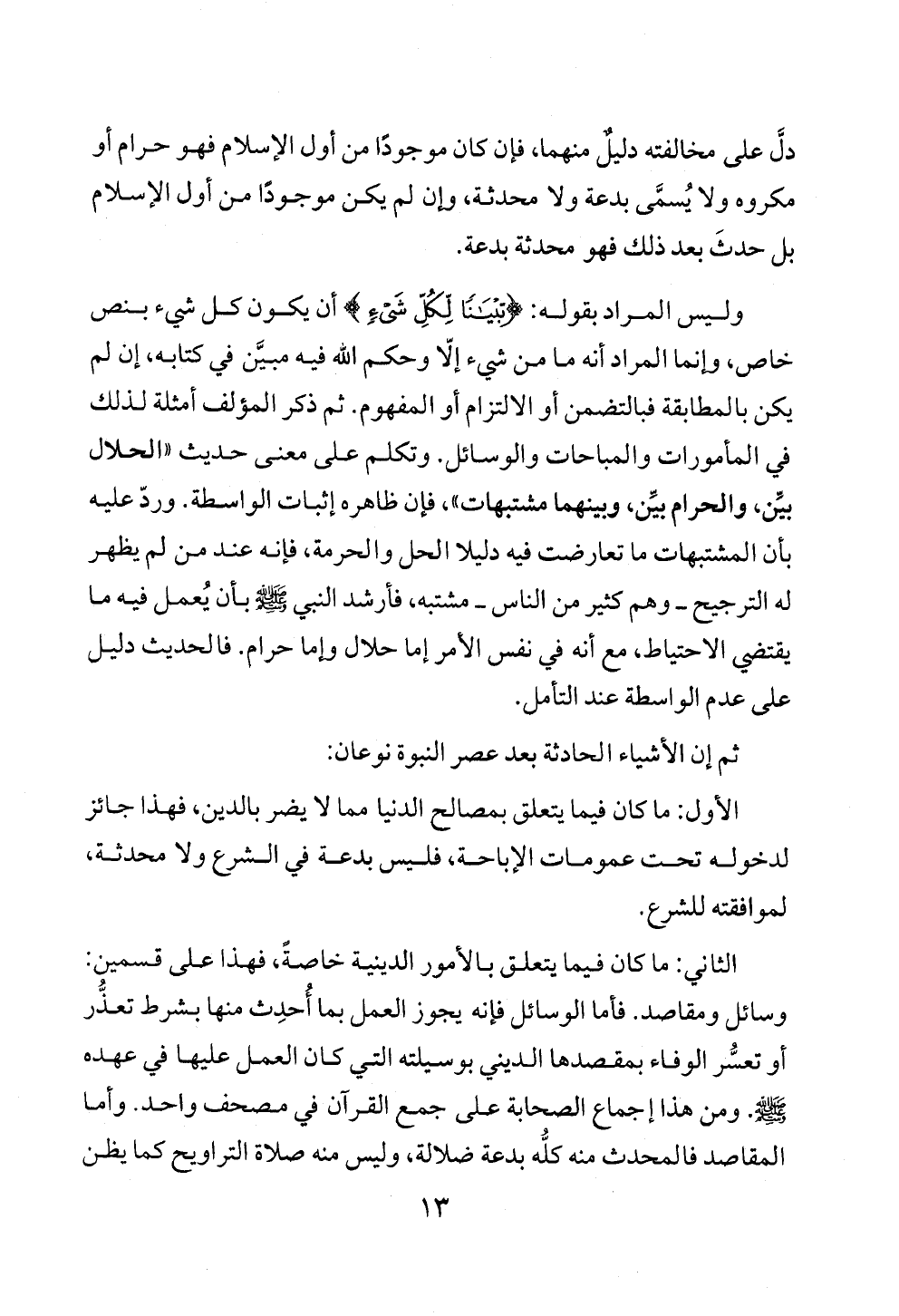 وليس المراد بقوله: {تِبْيَانًا لِكُلِّ شَيْءٍ} أن يكون كل شيء بنص خاص، وإنما المراد أنه ما من شيء إلّا وحكم الله فيه مبيَّن في كتابه، إن لم يكن بالمطابقة فبالتضمن أو الالتزام أو المفهوم. ثم ذكر المؤلف أمثلة لذلك في المأمورات والمباحات والوسائل. وتكلم على معنى حديث «الحلال بيِّن، والحرام بيِّن، وبينهما مشتبهات»، فإن ظاهره إثبات الواسطة. وردّ عليه بأن المشتبهات ما تعارضت فيه دليلا الحل والحرمة، فإنه عند من لم يظهر له الترجيح ــ وهم كثير من الناس ــ مشتبه، فأرشد النبي - صلى الله عليه وسلم - بأن يُعمل فيه ما يقتضي الاحتياط، مع أنه في نفس الأمر إما حلال وإما حرام. فالحديث دليل على عدم الواسطة عند التأمل.