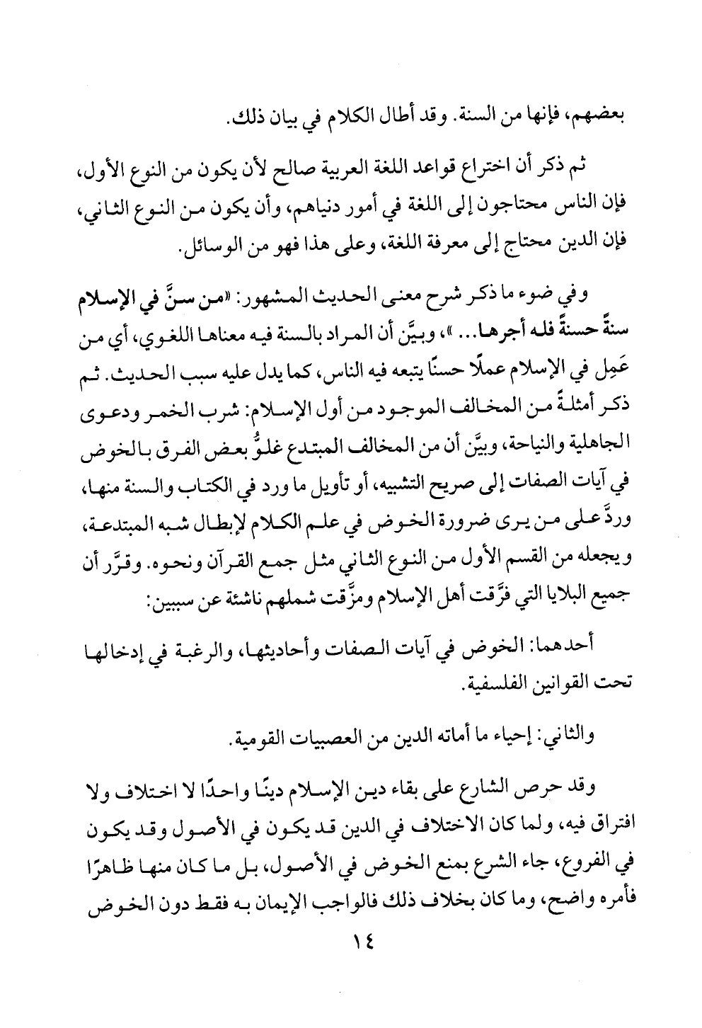 وفي ضوء ما ذكر شرح معنى الحديث المشهور: «من سنَّ في الإسلام سنةً حسنةً فله أجرها ... »، وبيَّن أن المراد بالسنة فيه معناها اللغوي، أي من عَمِل في الإسلام عملًا حسنًا يتبعه فيه الناس، كما يدل عليه سبب الحديث. ثم ذكر أمثلةً من المخالف الموجود من أول الإسلام: شرب الخمر ودعوى الجاهلية والنياحة، وبيَّن أن من المخالف المبتدع غلوُّ بعض الفرق بالخوض في آيات الصفات إلى صريح التشبيه، أو تأويل ما ورد في الكتاب والسنة منها، وردَّ على من يرى ضرورة الخوض في علم الكلام لإبطال شبه المبتدعة، ويجعله من القسم الأول من النوع الثاني مثل جمع القرآن ونحوه. وقرَّر أن جميع البلايا التي فرَّقت أهل الإسلام ومزَّقت شملهم ناشئة عن سببين: