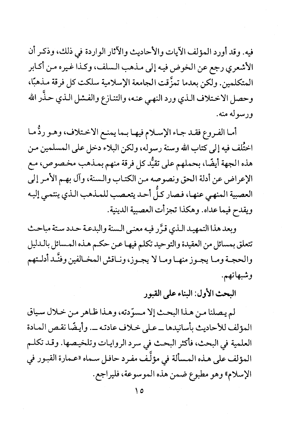 وبعد هذا التمهيد الذي قرَّر فيه معنى السنة والبدعة حدد ستة مباحث تتعلق بمسائل من العقيدة والتوحيد تكلم فيها عن حكم هذه المسائل بالدليل والحجة وما يجوز منها وما لا يجوز، وناقش المخالفين وفنَّد أدلتهم وشبهاتهم.