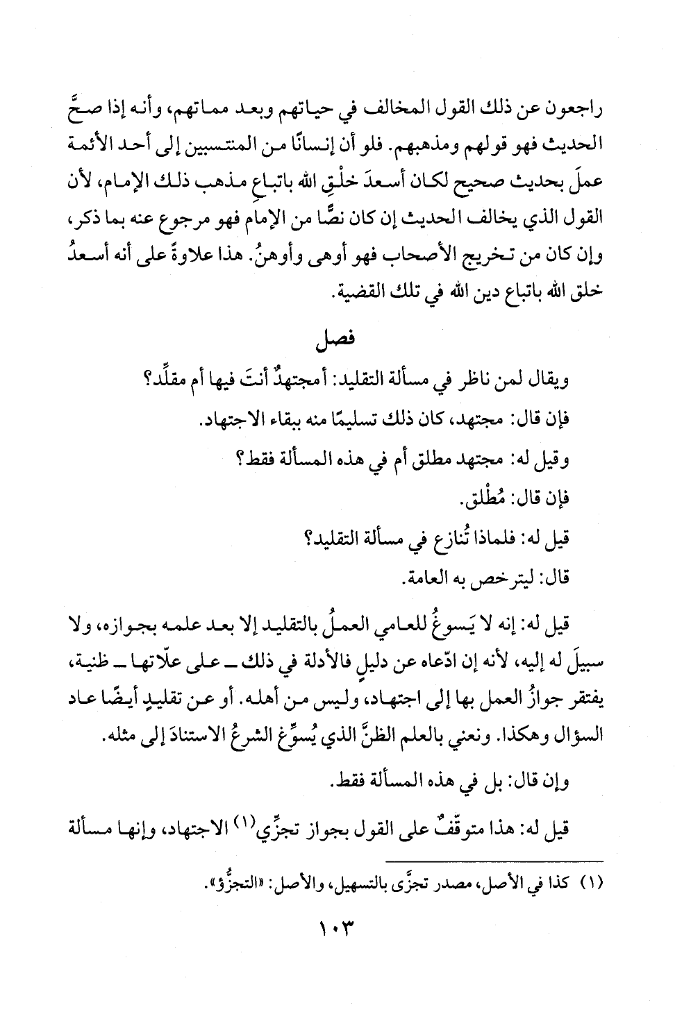 راجعون عن ذلك القول المخالف في حياتهم وبعد مماتهم، وأنه إذا صحَّ الحديث فهو قولهم ومذهبهم. فلو أن إنسانًا من المنتسبين إلى أحد الأئمة عملَ بحديث صحيح لكان أسعدَ خلْقِ الله باتباعِ مذهب ذلك الإمام، لأن القول الذي يخالف الحديث إن كان نصًّا من الإمام فهو مرجوع عنه بما ذكر، وإن كان من تخريج الأصحاب فهو أوهى وأوهنُ. هذا علاوةً على أنه أسعدُ خلق الله باتباع دين الله في تلك القضية.