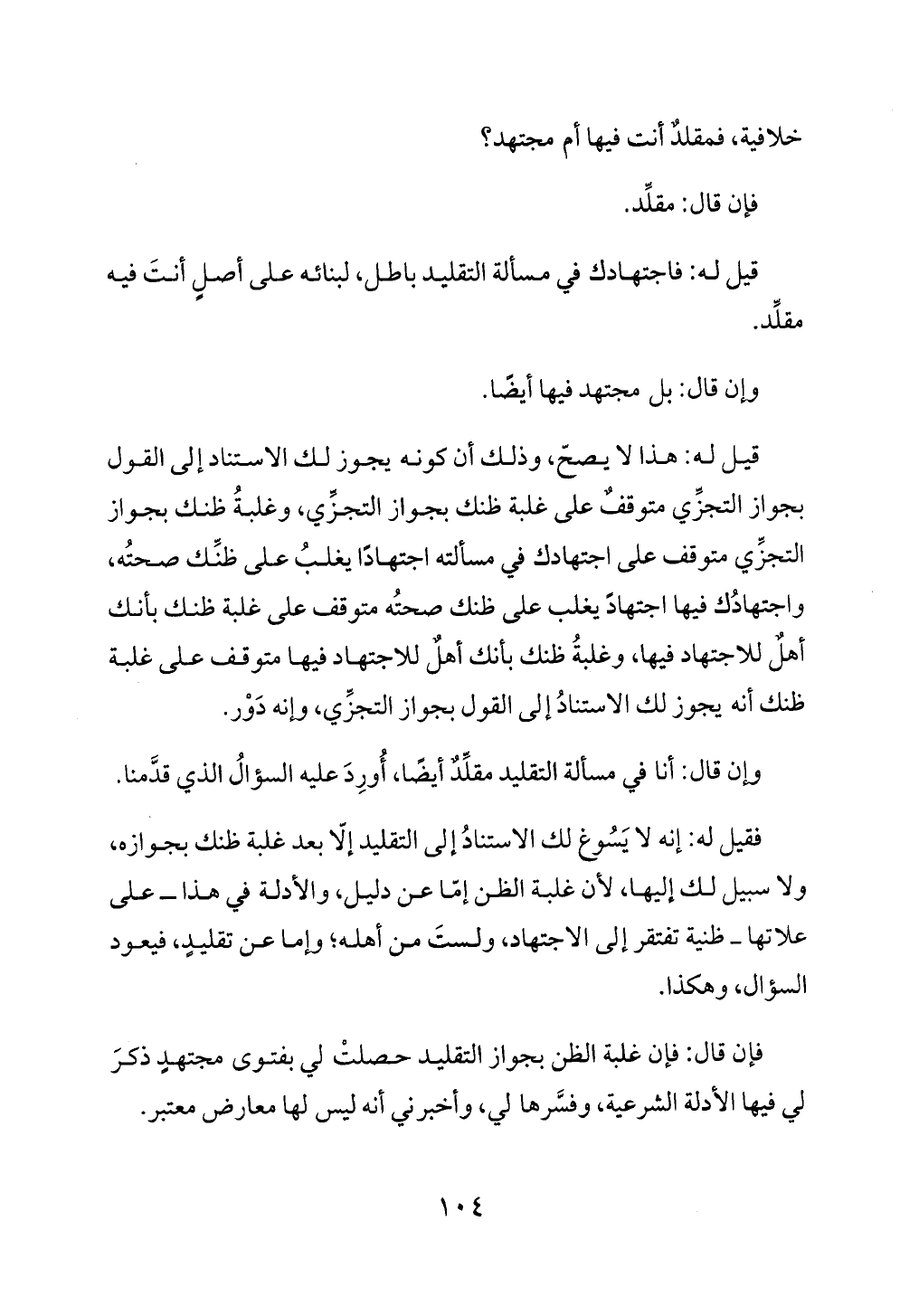 فقيل له: إنه لا يَسُوغ لك الاستنادُ إلى التقليد إلّا بعد غلبة ظنك بجوازه، ولا سبيل لك إليها، لأن غلبة الظن إمّا عن دليل، والأدلة في هذا ــ على علاتها ــ ظنية تفتقر إلى الاجتهاد، ولستَ من أهله؛ وإما عن تقليدٍ، فيعود السؤال، وهكذا.