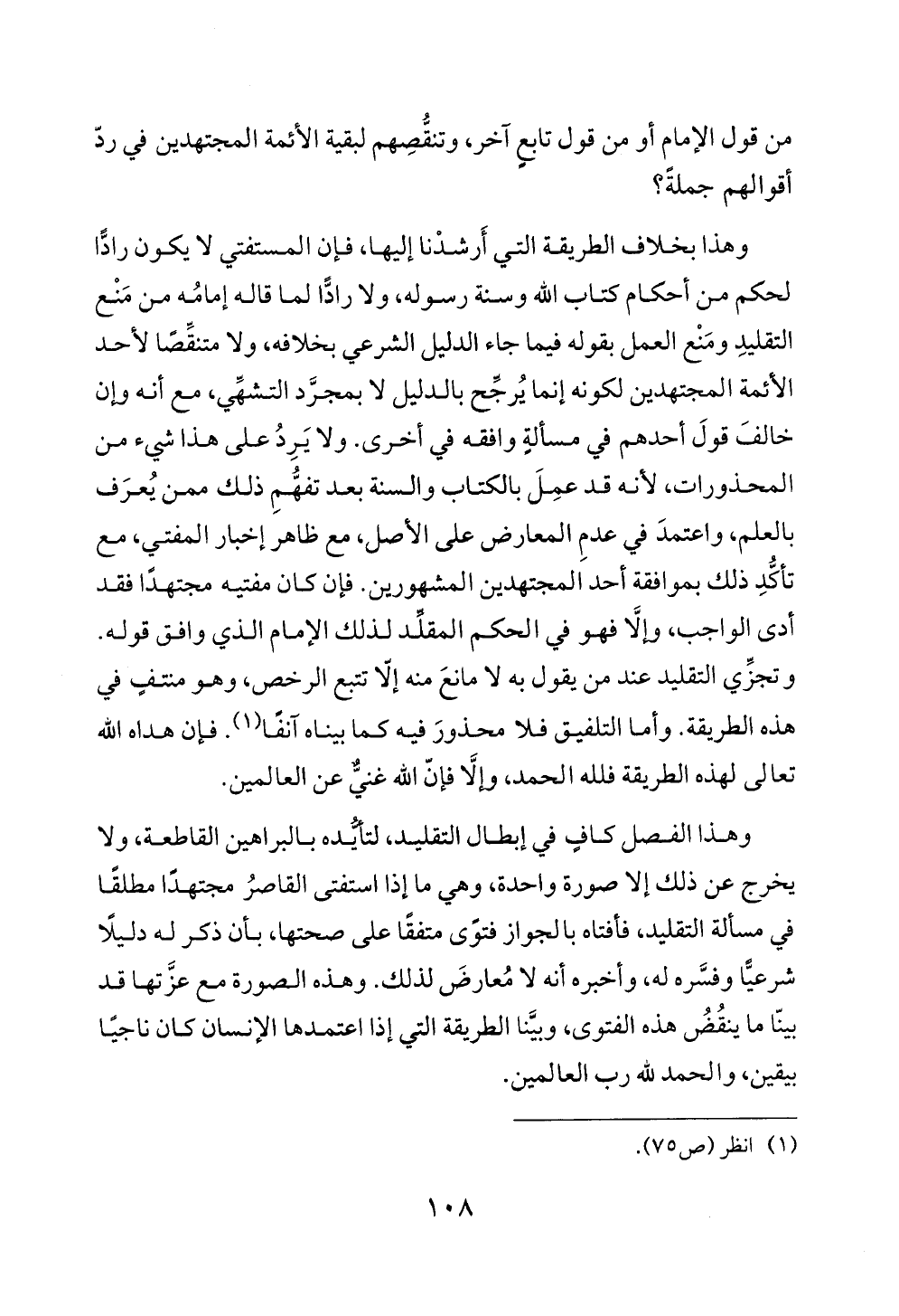 وهذا الفصل كافٍ في إبطال التقليد، لتأيُّده بالبراهين القاطعة، ولا يخرج عن ذلك إلا صورة واحدة، وهي ما إذا استفتى القاصرُ مجتهدًا مطلقًا في مسألة التقليد، فأفتاه بالجواز فتوًى متفقًا على صحتها، بأن ذكر له دليلًا شرعيًّا وفسَّره له، وأخبره أنه لا مُعارضَ لذلك. وهذه الصورة مع عزَّتها قد بينّا ما ينقُضُ هذه الفتوى، وبيَّنا الطريقة التي إذا اعتمدها الإنسان كان ناجيًا بيقين، والحمد لله رب العالمين.