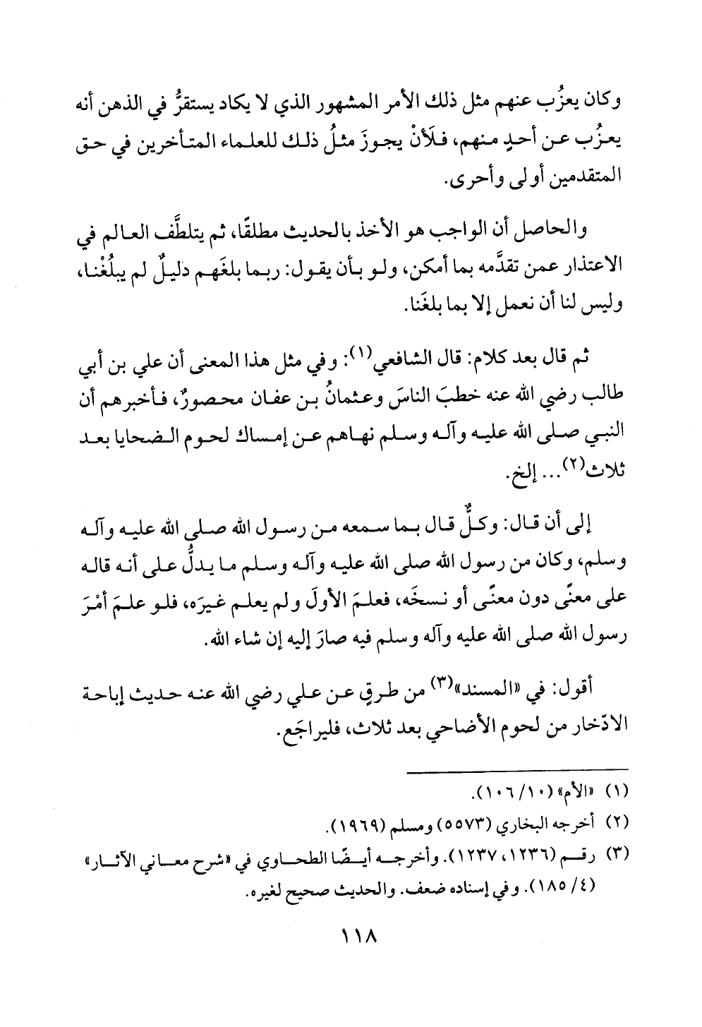 ثم قال بعد كلام: قال الشافعي (¬١): وفي مثل هذا المعنى أن علي بن أبي طالب رضي الله عنه خطبَ الناسَ وعثمانُ بن عفان محصورٌ، فأخبرهم أن النبي صلى الله عليه وآله وسلم نهاهم عن إمساك لحوم الضحايا بعد ثلاث (¬٢) ... إلخ.