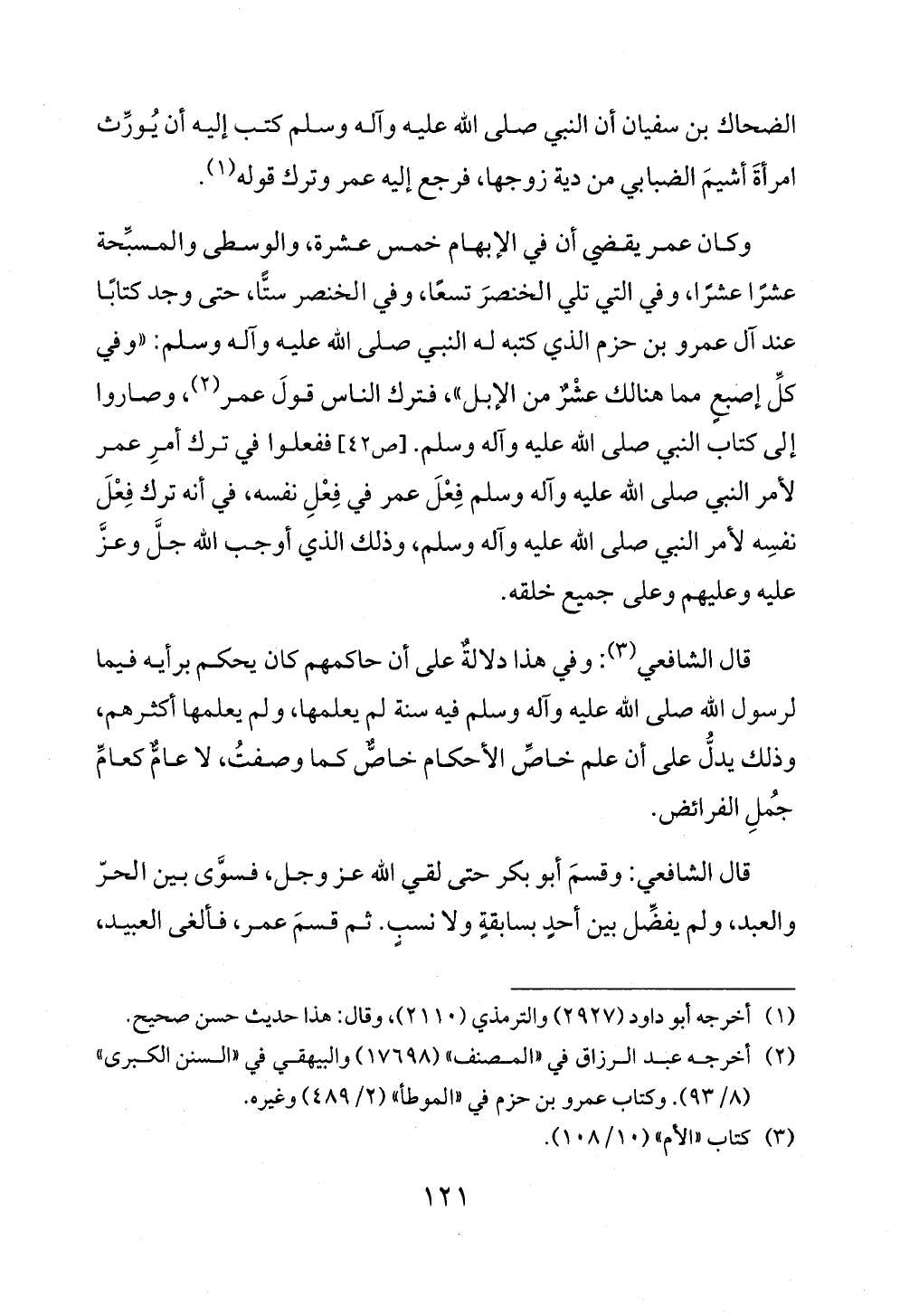 قال الشافعي: وقسمَ أبو بكر حتى لقي الله عز وجل، فسوَّى بين الحرّ والعبد، ولم يفضِّل بين أحدٍ بسابقةٍ ولا نسبٍ. ثم قسمَ عمر، فألغى العبيد،