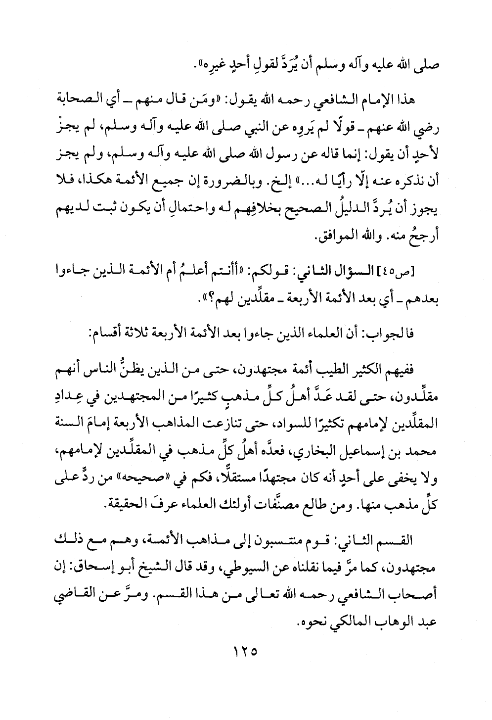[ص ٤٥] السؤال الثاني: قولكم: "أأنتم أعلمُ أم الأئمة الذين جاءوا بعدهم ــ أي بعد الأئمة الأربعة ــ مقلِّدين لهم؟ ".