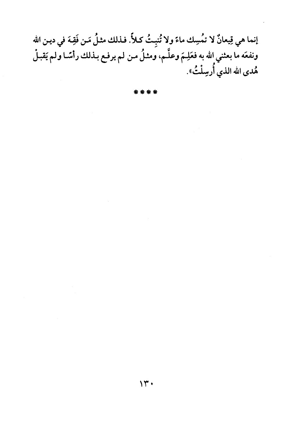 إنما هي قِيعانٌ لا تُمسِك ماءً ولا تُنبِتُ كلأً. فذلك مثلُ مَن فَقِهَ في دين الله ونفعَه ما بعثني الله به فعَلِمَ وعلَّم، ومثلُ من لم يرفع بذلك رأسًا ولم يَقبلْ هُدى الله الذي أُرسِلْتُ".