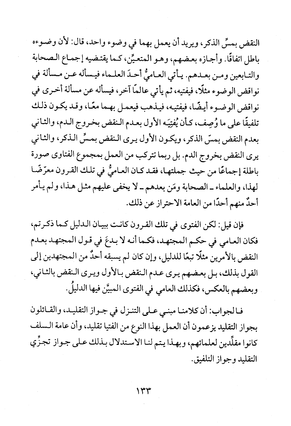 النقض بمسِّ الذكر، ويريد أن يعمل بهما في وضوء واحد، قال: لأن وضوءه باطل اتفاقًا. وأجازه بعضهم، وهو المتعيِّن، كما يقتضيه إجماع الصحابة والتابعين ومن بعدهم. يأتي العاميُّ أحدَ العلماء فيسأله عن مسألة في نواقض الوضوء مثلًا، فيفتيه، ثم يأتي عالمًا آخر، فيسأله عن مسألة أخرى في نواقض الوضوء أيضًا، فيفتيه، فيذهب فيعمل بهما معًا، وقد يكون ذلك تلفيقًا على ما وُصِف، كأن يُفتِيَه الأول بعدم النقض بخروج الدم، والثاني بعدم النقض بمسّ الذكر، ويكون الأول يرى النقض بمسِّ الذكر، والثاني يرى النقض بخروج الدم. بل ربما تتركب من العمل بمجموع الفتاوى صورة باطلة إجماعًا من حيث جملتها، فقد كان العاميُّ في تلك القرون معرّضًا لهذا، والعلماء ــ الصحابة ومَن بعدهم ــ لا يخفى عليهم مثل هذا، ولم يأمر أحدٌ منهم أحدًا من العامة الاحتراز عن ذلك.