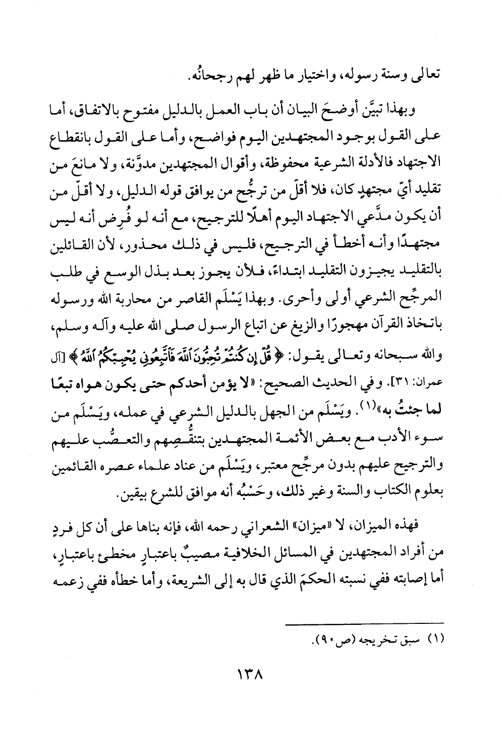 وبهذا تبيَّن أوضحَ البيان أن باب العمل بالدليل مفتوح بالاتفاق، أما على القول بوجود المجتهدين اليوم فواضح، وأما على القول بانقطاع الاجتهاد فالأدلة الشرعية محفوظة، وأقوال المجتهدين مدوَّنة، ولا مانعَ من تقليد أيّ مجتهدٍ كان، فلا أقلّ من ترجُّح من يوافق قوله الدليل، ولا أقلّ من أن يكون مدَّعي الاجتهاد اليوم أهلًا للترجيح، مع أنه لو فُرِض أنه ليس مجتهدًا وأنه أخطأ في الترجيح، فليس في ذلك محذور، لأن القائلين بالتقليد يجيزون التقليد ابتداءً، فلأن يجوز بعد بذل الوسع في طلب المرجِّح الشرعي أولى وأحرى. وبهذا يَسْلَم القاصر من محاربة الله ورسوله باتخاذ القرآن مهجورًا والزيغ عن اتباع الرسول صلى الله عليه وآله وسلم، والله سبحانه وتعالى يقول: {قُلْ إِنْ كُنْتُمْ تُحِبُّونَ اللَّهَ فَاتَّبِعُونِي يُحْبِبْكُمُ اللَّهُ} [آل عمران: ٣١]. وفي الحديث الصحيح: "لا يؤمن أحدكم حتى يكون هواه تبعًا لما جئتُ به" (¬١). ويَسْلَم من الجهل بالدليل الشرعي في عمله، ويَسْلَم من سوء الأدب مع بعض الأئمة المجتهدين بتنقُّصِهم والتعصُّب عليهم والترجيح عليهم بدون مرجِّح معتبر، ويَسْلَم من عناد علماء عصره القائمين بعلوم الكتاب والسنة وغير ذلك، وحَسْبُه أنه موافق للشرع بيقين.