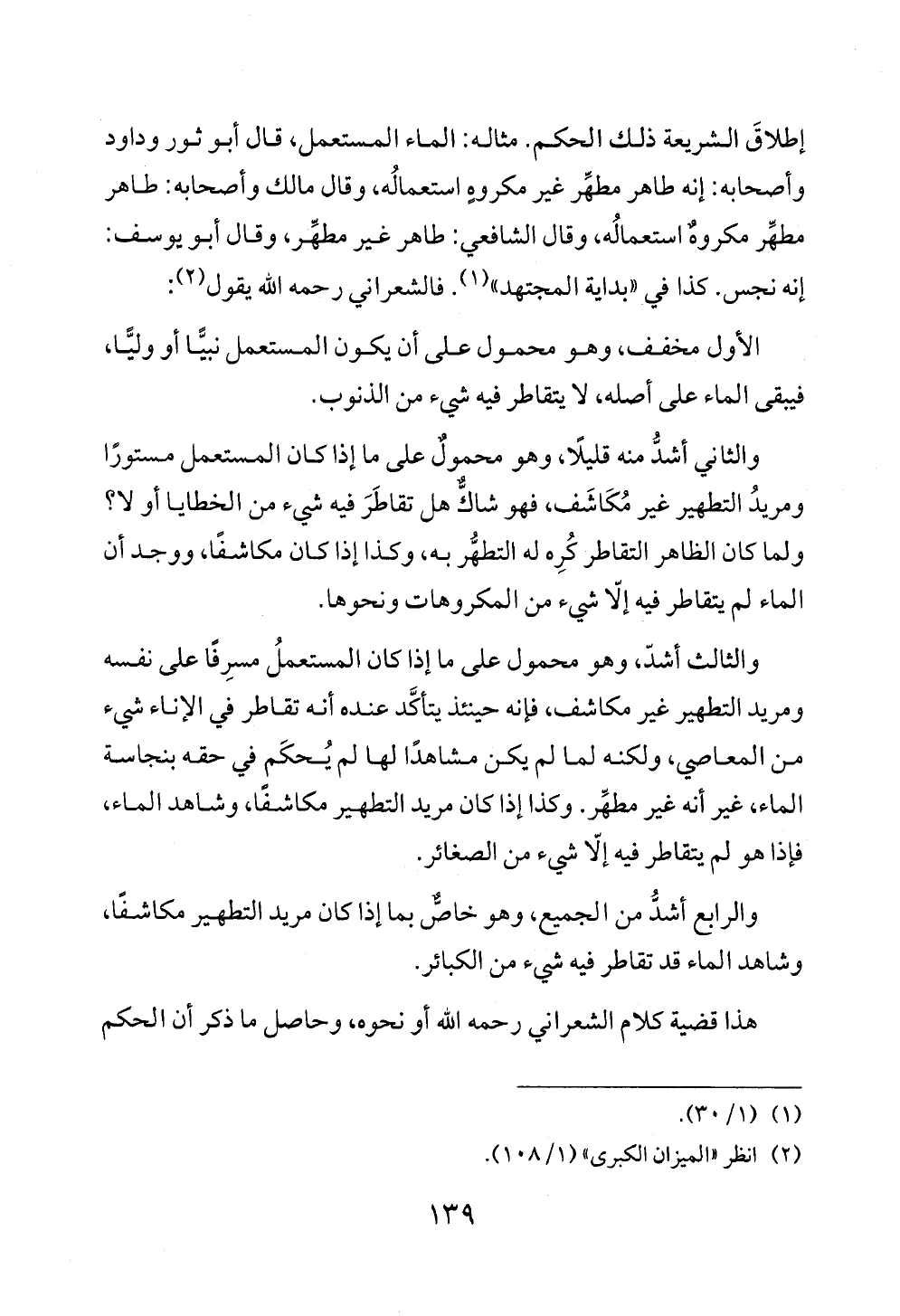 إطلاقَ الشريعة ذلك الحكم. مثاله: الماء المستعمل، قال أبو ثور وداود وأصحابه: إنه طاهر مطهِّر غير مكروهٍ استعمالُه، وقال مالك وأصحابه: طاهر مطهِّر مكروهٌ استعمالُه، وقال الشافعي: طاهر غير مطهِّر، وقال أبو يوسف: إنه نجس. كذا في "بداية المجتهد" (¬١). فالشعراني رحمه الله يقول (¬٢):