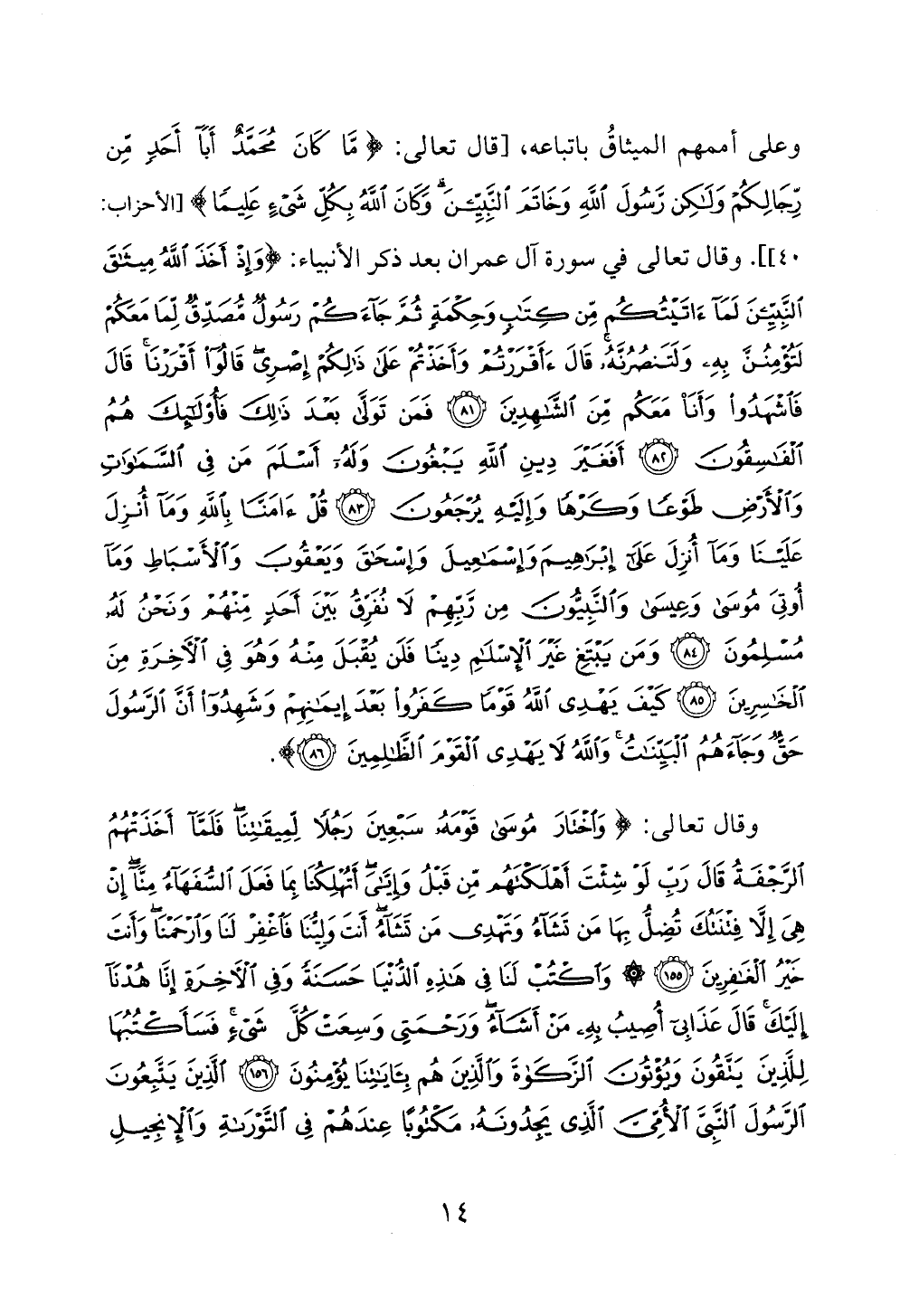 وعلى أممهم الميثاقُ باتباعه، [قال تعالى: {مَا كَانَ مُحَمَّدٌ أَبَا أَحَدٍ مِنْ رِجَالِكُمْ وَلَكِنْ رَسُولَ اللَّهِ وَخَاتَمَ النَّبِيِّينَ وَكَانَ اللَّهُ بِكُلِّ شَيْءٍ عَلِيمًا} [الأحزاب: ٤٠]]. وقال تعالى في سورة آل عمران بعد ذكر الأنبياء: {وَإِذْ أَخَذَ اللَّهُ مِيثَاقَ النَّبِيِّينَ لَمَا آتَيْتُكُمْ مِنْ كِتَابٍ وَحِكْمَةٍ ثُمَّ جَاءَكُمْ رَسُولٌ مُصَدِّقٌ لِمَا مَعَكُمْ لَتُؤْمِنُنَّ بِهِ وَلَتَنْصُرُنَّهُ قَالَ أَأَقْرَرْتُمْ وَأَخَذْتُمْ عَلَى ذَلِكُمْ إِصْرِي قَالُوا أَقْرَرْنَا قَالَ فَاشْهَدُوا وَأَنَا مَعَكُمْ مِنَ الشَّاهِدِينَ (٨١) فَمَنْ تَوَلَّى بَعْدَ ذَلِكَ فَأُولَئِكَ هُمُ الْفَاسِقُونَ (٨٢) أَفَغَيْرَ دِينِ اللَّهِ يَبْغُونَ وَلَهُ أَسْلَمَ مَنْ فِي السَّمَاوَاتِ وَالْأَرْضِ طَوْعًا وَكَرْهًا وَإِلَيْهِ يُرْجَعُونَ (٨٣) قُلْ آمَنَّا بِاللَّهِ وَمَا أُنْزِلَ عَلَيْنَا وَمَا أُنْزِلَ عَلَى إِبْرَاهِيمَ وَإِسْمَاعِيلَ وَإِسْحَاقَ وَيَعْقُوبَ وَالْأَسْبَاطِ وَمَا أُوتِيَ مُوسَى وَعِيسَى وَالنَّبِيُّونَ مِنْ رَبِّهِمْ لَا نُفَرِّقُ بَيْنَ أَحَدٍ مِنْهُمْ وَنَحْنُ لَهُ مُسْلِمُونَ (٨٤) وَمَنْ يَبْتَغِ غَيْرَ الْإِسْلَامِ دِينًا فَلَنْ يُقْبَلَ مِنْهُ وَهُوَ فِي الْآخِرَةِ مِنَ الْخَاسِرِينَ (٨٥) كَيْفَ يَهْدِي اللَّهُ قَوْمًا كَفَرُوا بَعْدَ إِيمَانِهِمْ وَشَهِدُوا أَنَّ الرَّسُولَ حَقٌّ وَجَاءَهُمُ الْبَيِّنَاتُ وَاللَّهُ لَا يَهْدِي الْقَوْمَ الظَّالِمِينَ (٨٦)}.