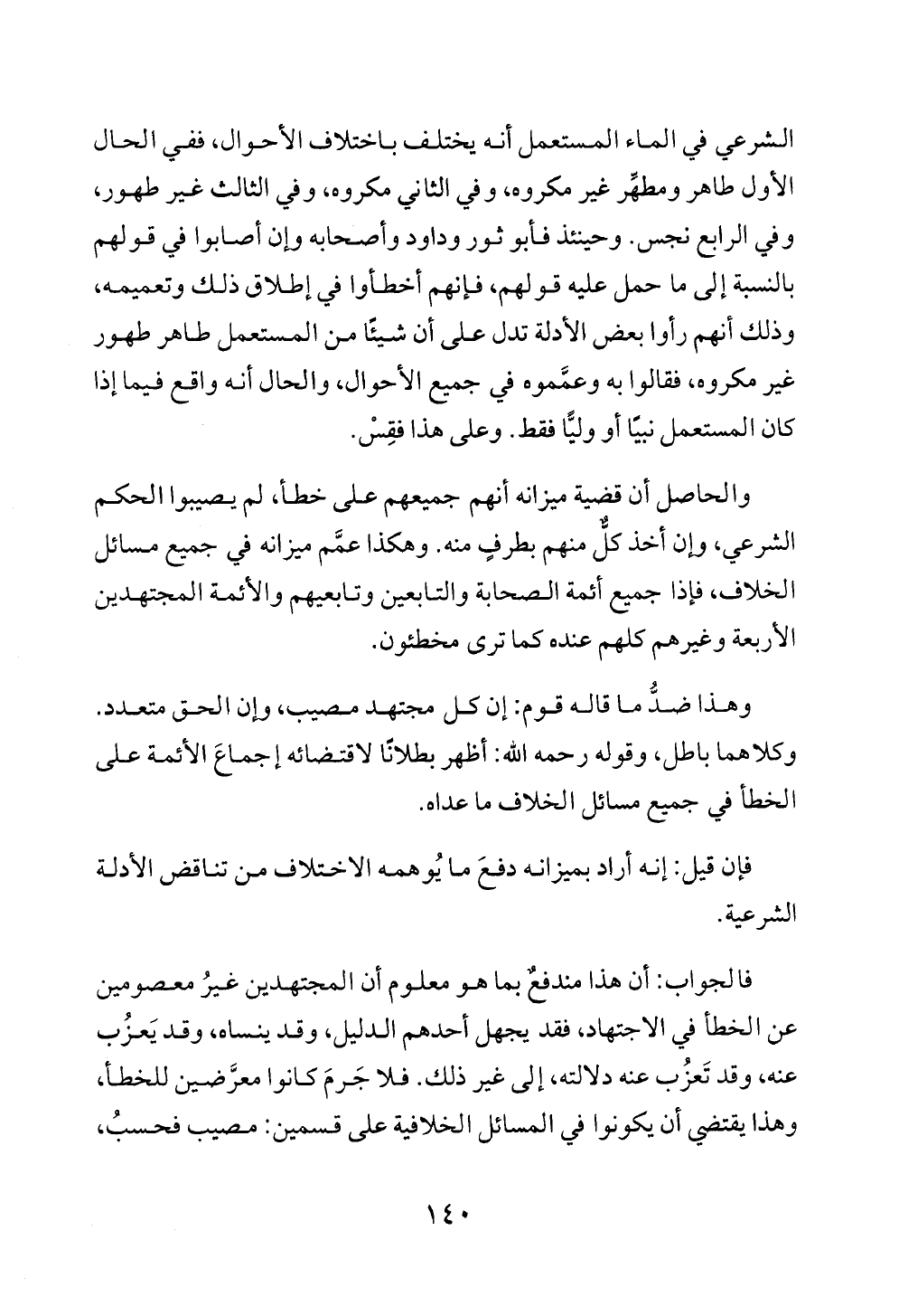 والحاصل أن قضية ميزانه أنهم جميعهم على خطأ، لم يصيبوا الحكم الشرعي، وإن أخذ كلٌّ منهم بطرفٍ منه. وهكذا عمَّم ميزانه في جميع مسائل الخلاف، فإذا جميع أئمة الصحابة والتابعين وتابعيهم والأئمة المجتهدين الأربعة وغيرهم كلهم عنده كما ترى مخطئون.