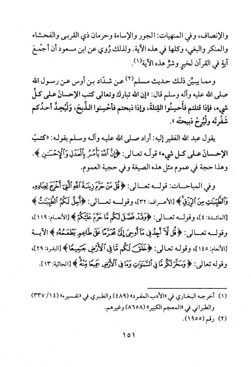 يقول عبد الله الفقير إليه: أراد صلى الله عليه وآله وسلم بقوله: "كتبَ الإحسانَ على كل شيء" قولَه تعالى: {إِنَّ اللَّهَ يَأْمُرُ بِالْعَدْلِ وَالْإِحْسَانِ}. وهذا حجة في عموم مثل هذه الصيغة وفي حجية العموم.