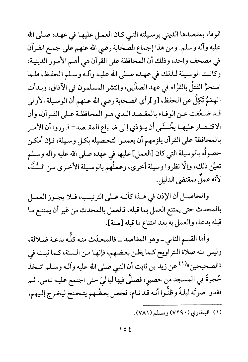 الوفاء بمقصدها الديني بوسيلته التي كان العمل عليها في عهده صلى الله عليه وآله وسلم. ومن هذا إجماع الصحابة رضي الله عنهم على جمع القرآن في مصحف واحد، وذلك أن المحافظة على القرآن هي أهم الأمور الدينية، وكانت الوسيلة لذلك في عهده صلى الله عليه وآله وسلم الحفظ، فلما استحرَّ القتلُ بالقرَّاء في عهد الصدِّيق، وانتشر المسلمون في الآفاق، وبدأت الهِمَمُ تَكِلِّ عن الحفظ، [و] رأى الصحابة رضي الله عنهم أن الوسيلة الأولى قد ضعُفت عن الوفاء بالمقصد الذي هو المحافظة على القرآن، وأن الاقتصار عليها يُخشَى أن يؤدّي إلى ضياع المقصد= قرروا أن الأمر بالمحافظة على القرآن يلزمهم أن يعملوا لتحصيله بكل وسيلة، فإن أمكن حصولُه بالوسيلة التي كان [العمل] عليها في عهده صلى الله عليه وآله وسلم تعيَّن ذلك، وإلّا نظروا وسيلة أخرى، وعملُهم بالوسيلة الأخرى من السُّنَّة، لأنه عملٌ بمقتضى الدليل.