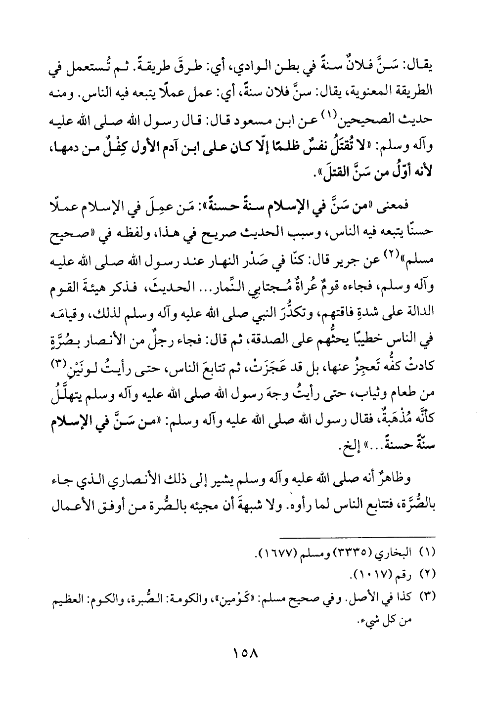 فمعنى "من سَنَّ في الإسلام سنةً حسنةً": مَن عمِلَ في الإسلام عملًا حسنًا يتبعه فيه الناس، وسبب الحديث صريح في هذا، ولفظه في "صحيح مسلم" (¬٢) عن جرير قال: كنّا في صَدْر النهار عند رسول الله صلى الله عليه وآله وسلم، فجاءه قومٌ عُراةٌ مُجتابِي النِّمار ... الحديثَ، فذكر هيئةَ القوم الدالة على شدةِ فاقتهم، وتكدُّرَ النبي صلى الله عليه وآله وسلم لذلك، وقيامَه في الناس خطيبًا يحثُّهم على الصدقة، ثم قال: فجاء رجلٌ من الأنصار بصُرَّةٍ كادتْ كفُّه تَعجِزُ عنها، بل قد عَجَزَتْ، ثم تتابعَ الناس، حتى رأيتُ لونَيْنِ (¬٣) من طعام وثياب، حتى رأيتُ وجهَ رسول الله صلى الله عليه وآله وسلم يتهلَّلُ كأنَّه مُذْهَبةٌ، فقال رسول الله صلى الله عليه وآله وسلم: "من سَنَّ في الإسلام سنّةً حسنةً ... " إلخ.