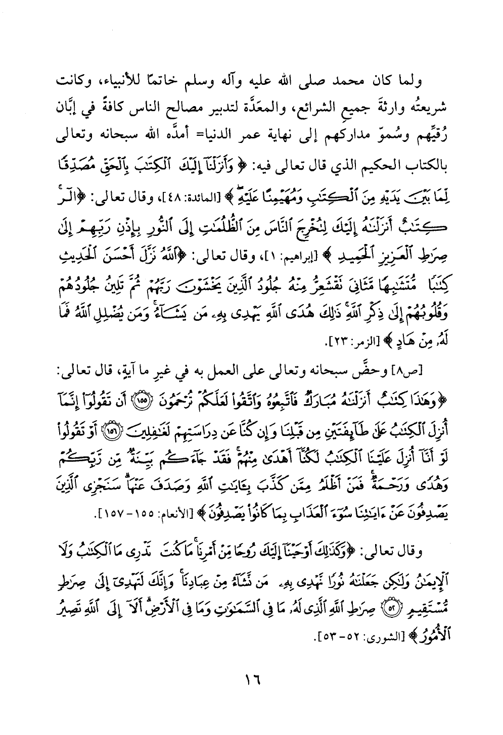[ص ٨] وحضَّ سبحانه وتعالى على العمل به في غيرِ ما آيةٍ، قال تعالى: {وَهَذَا كِتَابٌ أَنْزَلْنَاهُ مُبَارَكٌ فَاتَّبِعُوهُ وَاتَّقُوا لَعَلَّكُمْ تُرْحَمُونَ (١٥٥) أَنْ تَقُولُوا إِنَّمَا أُنْزِلَ الْكِتَابُ عَلَى طَائِفَتَيْنِ مِنْ قَبْلِنَا وَإِنْ كُنَّا عَنْ دِرَاسَتِهِمْ لَغَافِلِينَ (١٥٦) أَوْ تَقُولُوا لَوْ أَنَّا أُنْزِلَ عَلَيْنَا الْكِتَابُ لَكُنَّا أَهْدَى مِنْهُمْ فَقَدْ جَاءَكُمْ بَيِّنَةٌ مِنْ رَبِّكُمْ وَهُدًى وَرَحْمَةٌ فَمَنْ أَظْلَمُ مِمَّنْ كَذَّبَ بِآيَاتِ اللَّهِ وَصَدَفَ عَنْهَا سَنَجْزِي الَّذِينَ يَصْدِفُونَ عَنْ آيَاتِنَا سُوءَ الْعَذَابِ بِمَا كَانُوا يَصْدِفُونَ} [الأنعام: ١٥٥ - ١٥٧].