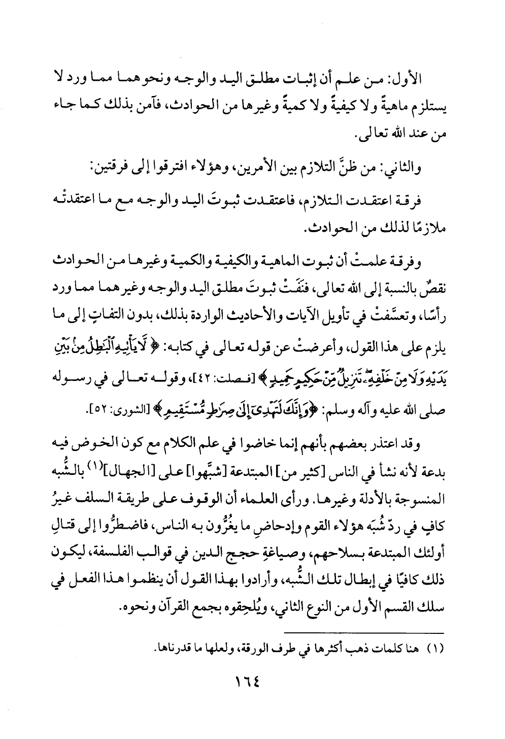 وفرقة علمتْ أن ثبوت الماهية والكيفية والكمية وغيرها من الحوادث نقصٌ بالنسبة إلى الله تعالى، فنَفَتْ ثبوتَ مطلق اليد والوجه وغيرهما مما ورد رأسًا، وتعسَّفتْ في تأويل الآيات والأحاديث الواردة بذلك، بدون التفاتٍ إلى ما يلزم على هذا القول، وأعرضتْ عن قوله تعالى في كتابه: {لَا يَأْتِيهِ الْبَاطِلُ مِنْ بَيْنِ يَدَيْهِ وَلَا مِنْ خَلْفِهِ تَنْزِيلٌ مِنْ حَكِيمٍ حَمِيدٍ} [فصلت: ٤٢]، وقوله تعالى في رسوله صلى الله عليه وآله وسلم: {وَإِنَّكَ لَتَهْدِي إِلَى صِرَاطٍ مُسْتَقِيمٍ} [الشورى: ٥٢].