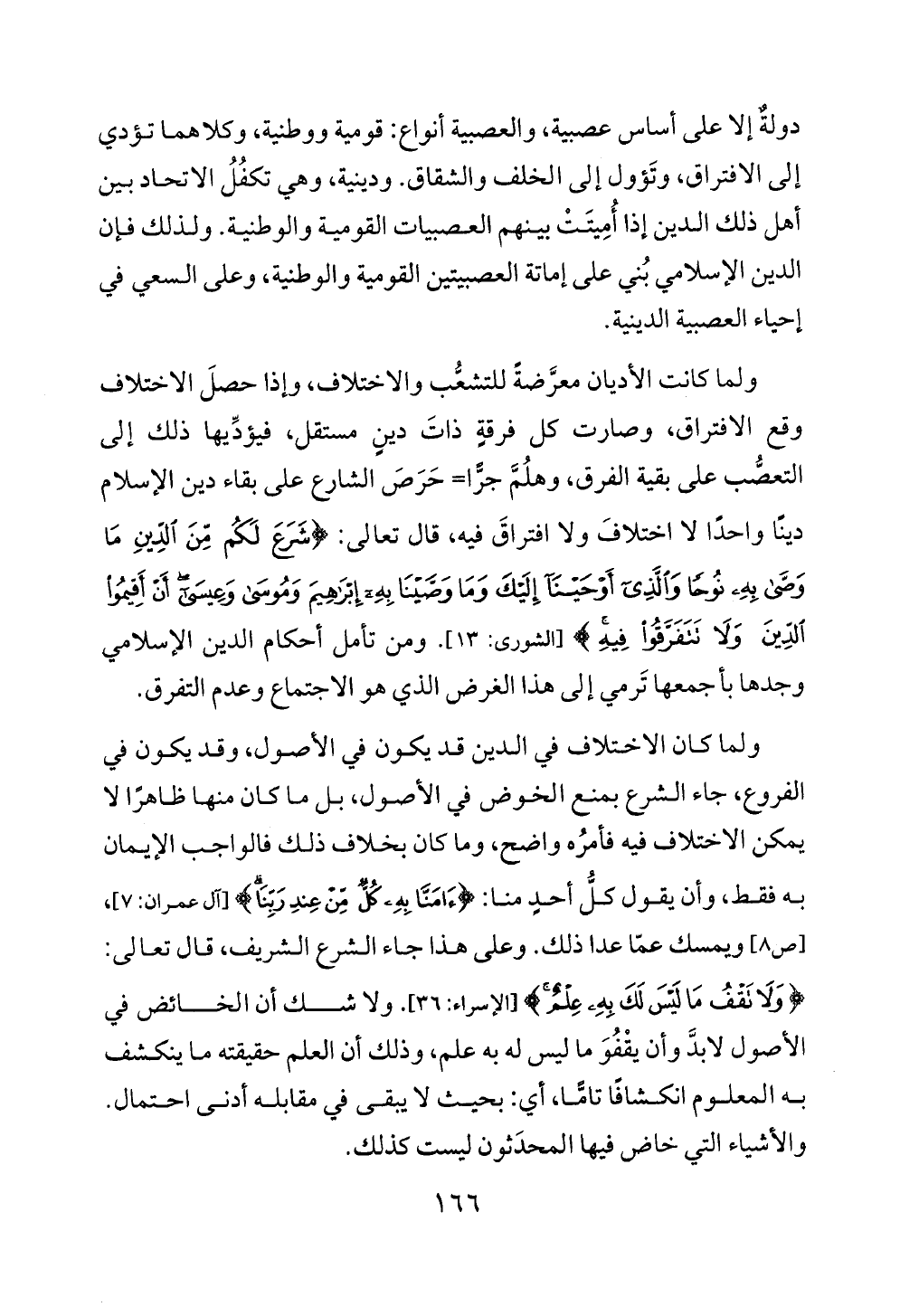 دولةٌ إلا على أساس عصبية، والعصبية أنواع: قومية ووطنية، وكلاهما تؤدي إلى الافتراق، وتَؤول إلى الخلف والشقاق. ودينية، وهي تكفُلُ الاتحاد بين أهل ذلك الدين إذا أُمِيتَتْ بينهم العصبيات القومية والوطنية. ولذلك فإن الدين الإسلامي بُني على إماتة العصبيتين القومية والوطنية، وعلى السعي في إحياء العصبية الدينية.