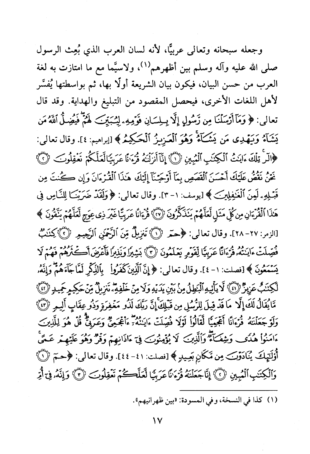 وجعله سبحانه وتعالى عربيًّا، لأنه لسان العرب الذي بُعِث الرسول صلى الله عليه وآله وسلم بين أظهرهم (¬١)، ولاسيَّما مع ما امتازت به لغة العرب من حسن البيان، فيكون بيان الشريعة أولًا بها، ثم بواسطتها يُفسَّر لأهل اللغات الأخرى، فيحصل المقصود من التبليغ والهداية. وقد قال تعالى: {وَمَا أَرْسَلْنَا مِنْ رَسُولٍ إِلَّا بِلِسَانِ قَوْمِهِ لِيُبَيِّنَ لَهُمْ فَيُضِلُّ اللَّهُ مَنْ يَشَاءُ وَيَهْدِي مَنْ يَشَاءُ وَهُوَ الْعَزِيزُ الْحَكِيمُ} [إبراهيم: ٤]. وقال تعالى: {الر تِلْكَ آيَاتُ الْكِتَابِ الْمُبِينِ (١) إِنَّا أَنْزَلْنَاهُ قُرْآنًا عَرَبِيًّا لَعَلَّكُمْ تَعْقِلُونَ (٢) نَحْنُ نَقُصُّ عَلَيْكَ أَحْسَنَ الْقَصَصِ بِمَا أَوْحَيْنَا إِلَيْكَ هَذَا الْقُرْآنَ وَإِنْ كُنْتَ مِنْ قَبْلِهِ لَمِنَ الْغَافِلِينَ} [يوسف: ١ - ٣]. وقال تعالى: {وَلَقَدْ ضَرَبْنَا لِلنَّاسِ فِي هَذَا الْقُرْآنِ مِنْ كُلِّ مَثَلٍ لَعَلَّهُمْ يَتَذَكَّرُونَ (٢٧) قُرْآنًا عَرَبِيًّا غَيْرَ ذِي عِوَجٍ لَعَلَّهُمْ يَتَّقُونَ} [الزمر: ٢٧ - ٢٨]. وقال تعالى: {حم (١) تَنْزِيلٌ مِنَ الرَّحْمَنِ الرَّحِيمِ (٢) كِتَابٌ فُصِّلَتْ آيَاتُهُ قُرْآنًا عَرَبِيًّا لِقَوْمٍ يَعْلَمُونَ (٣) بَشِيرًا وَنَذِيرًا فَأَعْرَضَ أَكْثَرُهُمْ فَهُمْ لَا يَسْمَعُونَ} [فصلت: ١ - ٤]. وقال تعالى: {إِنَّ الَّذِينَ كَفَرُوا بِالذِّكْرِ لَمَّا جَاءَهُمْ وَإِنَّهُ لَكِتَابٌ عَزِيزٌ (٤١) لَا يَأْتِيهِ الْبَاطِلُ مِنْ بَيْنِ يَدَيْهِ وَلَا مِنْ خَلْفِهِ تَنْزِيلٌ مِنْ حَكِيمٍ حَمِيدٍ (٤٢) مَا يُقَالُ لَكَ إِلَّا مَا قَدْ قِيلَ لِلرُّسُلِ مِنْ قَبْلِكَ إِنَّ رَبَّكَ لَذُو مَغْفِرَةٍ وَذُو عِقَابٍ أَلِيمٍ (٤٣) وَلَوْ جَعَلْنَاهُ قُرْآنًا أَعْجَمِيًّا لَقَالُوا لَوْلَا فُصِّلَتْ آيَاتُهُ أَأَعْجَمِيٌّ وَعَرَبِيٌّ قُلْ هُوَ لِلَّذِينَ آمَنُوا هُدًى وَشِفَاءٌ وَالَّذِينَ لَا يُؤْمِنُونَ فِي آذَانِهِمْ وَقْرٌ وَهُوَ عَلَيْهِمْ عَمًى أُولَئِكَ يُنَادَوْنَ مِنْ مَكَانٍ بَعِيدٍ} [فصلت: ٤١ - ٤٤]. وقال تعالى: {حم (١) وَالْكِتَابِ الْمُبِينِ (٢) إِنَّا جَعَلْنَاهُ قُرْآنًا عَرَبِيًّا لَعَلَّكُمْ تَعْقِلُونَ (٣) وَإِنَّهُ فِي أُمِّ