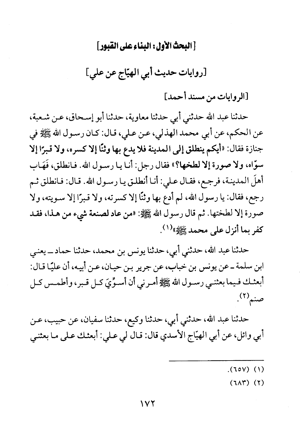 حدثنا عبد الله حدثني أبي حدثنا معاوية، حدثنا أبو إسحاق، عن شعبة، عن الحكم، عن أبي محمد الهذلي، عن علي، قال: كان رسول الله - صلى الله عليه وسلم - في جنازة فقال: «أيكم ينطلق إلى المدينة فلا يدع بها وثنًا إلا كسره، ولا قبرًا إلا سوّاه، ولا صورة إلا لطخها؟» فقال رجل: أنا يا رسول الله. فانطلق، فَهَاب أهلَ المدينة، فرجع، فقال علي: أنا أنطلق يا رسول الله. قال: فانطلق ثم رجع، فقال: يا رسول الله، لم أدع بها وثنًا إلا كسرته، ولا قبرًا إلا سويته، ولا صورة إلا لطختها. ثم قال رسول الله - صلى الله عليه وسلم -: «من عاد لصنعة شيء من هذا، فقد كفر بما أنزل على محمد - صلى الله عليه وسلم -» (¬١).