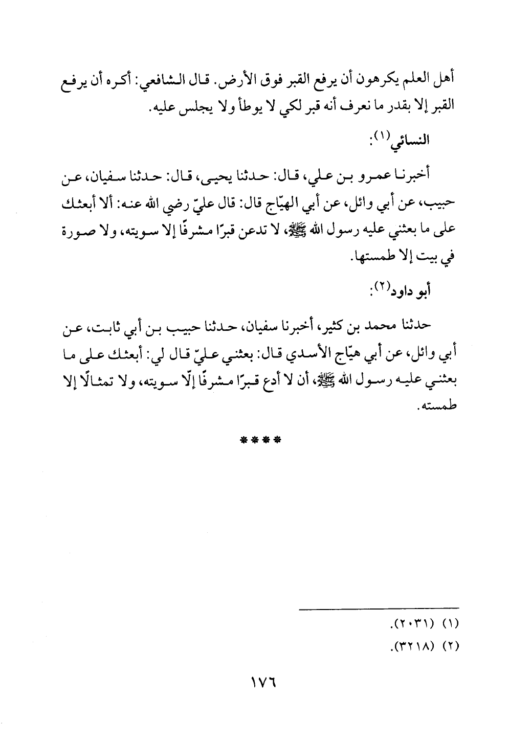 حدثنا محمد بن كثير، أخبرنا سفيان، حدثنا حبيب بن أبي ثابت، عن أبي وائل، عن أبي هيّاج الأسدي قال: بعثني عليّ قال لي: أبعثك على ما بعثني عليه رسول الله - صلى الله عليه وسلم - ، أن لا أدع قبرًا مشرفًا إلّا سويته، ولا تمثالًا إلا طمسته.