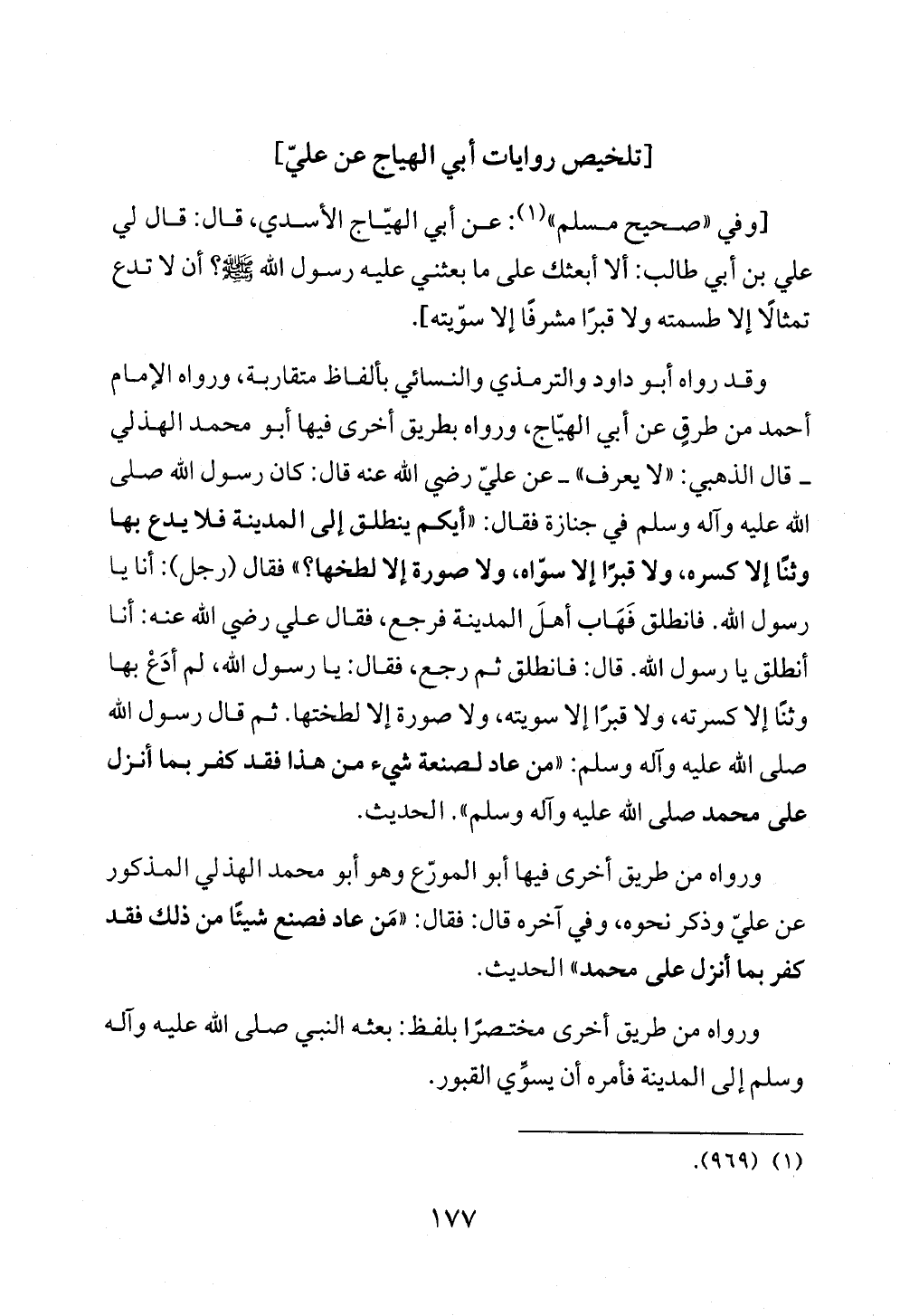 وقد رواه أبو داود والترمذي والنسائي بألفاظ متقاربة، ورواه الإمام أحمد من طرقٍ عن أبي الهيّاج، ورواه بطريق أخرى فيها أبو محمد الهذلي ــ قال الذهبي: «لا يعرف» ــ عن عليّ رضي الله عنه قال: كان رسول الله صلى الله عليه وآله وسلم في جنازة فقال: «أيكم ينطلق إلى المدينة فلا يدع بها وثنًا إلا كسره، ولا قبرًا إلا سوّاه، ولا صورة إلا لطخها؟» فقال (رجل): أنا يا رسول الله. فانطلق فَهَاب أهلَ المدينة فرجع، فقال علي رضي الله عنه: أنا أنطلق يا رسول الله. قال: فانطلق ثم رجع، فقال: يا رسول الله، لم أدَعْ بها وثنًا إلا كسرته، ولا قبرًا إلا سويته، ولا صورة إلا لطختها. ثم قال رسول الله صلى الله عليه وآله وسلم: «من عاد لصنعة شيء من هذا فقد كفر بما أنزل على محمد صلى الله عليه وآله وسلم». الحديث.