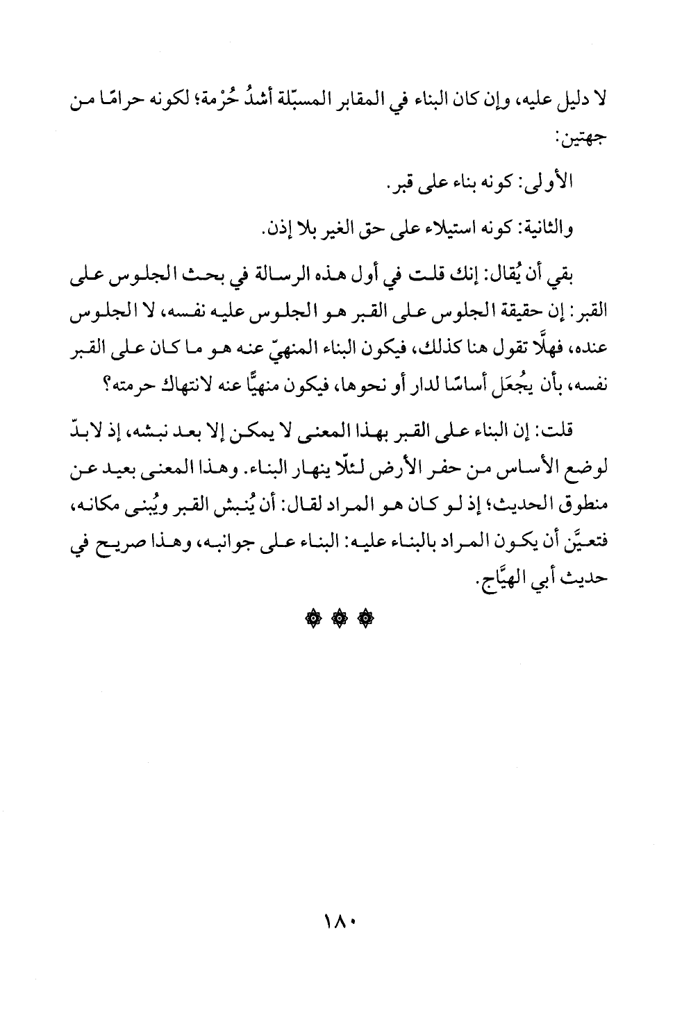 بقي أن يُقال: إنك قلت في أول هذه الرسالة في بحث الجلوس على القبر: إن حقيقة الجلوس على القبر هو الجلوس عليه نفسه، لا الجلوس عنده، فهلَّا تقول هنا كذلك، فيكون البناء المنهيّ عنه هو ما كان على القبر نفسه، بأن يُجعَل أساسًا لدار أو نحوها، فيكون منهيًّا عنه لانتهاك حرمته؟