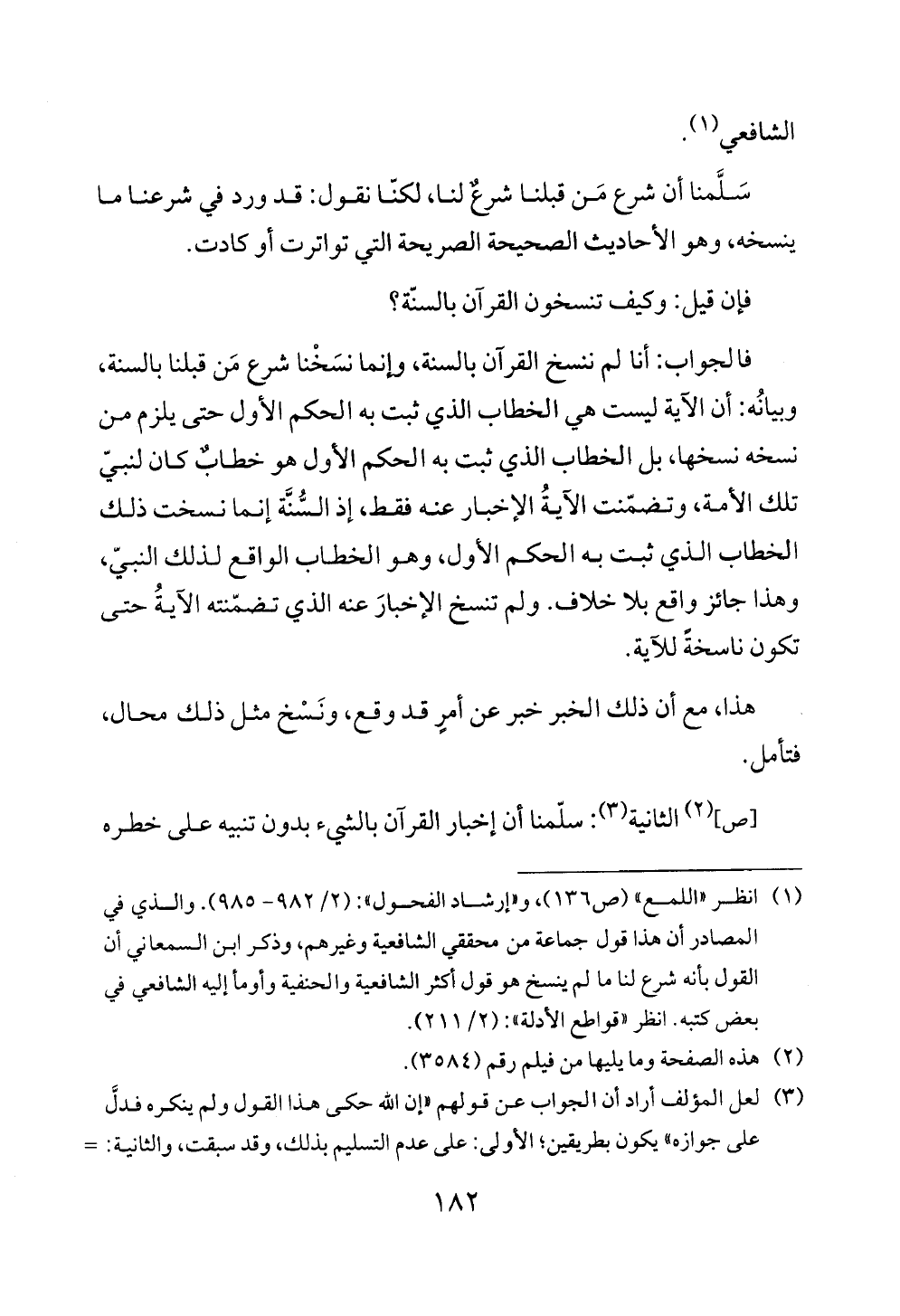 فالجواب: أنا لم ننسخ القرآن بالسنة، وإنما نسَخْنا شرع مَن قبلنا بالسنة، وبيانُه: أن الآية ليست هي الخطاب الذي ثبت به الحكم الأول حتى يلزم من نسخه نسخها، بل الخطاب الذي ثبت به الحكم الأول هو خطابٌ كان لنبيّ تلك الأمة، وتضمّنت الآيةُ الإخبار عنه فقط، إذ السُّنَّة إنما نسخت ذلك الخطاب الذي ثبت به الحكم الأول، وهو الخطاب الواقع لذلك النبيّ، وهذا جائز واقع بلا خلاف. ولم تنسخ الإخبارَ عنه الذي تضمّنته الآيةُ حتى تكون ناسخةً للآية.