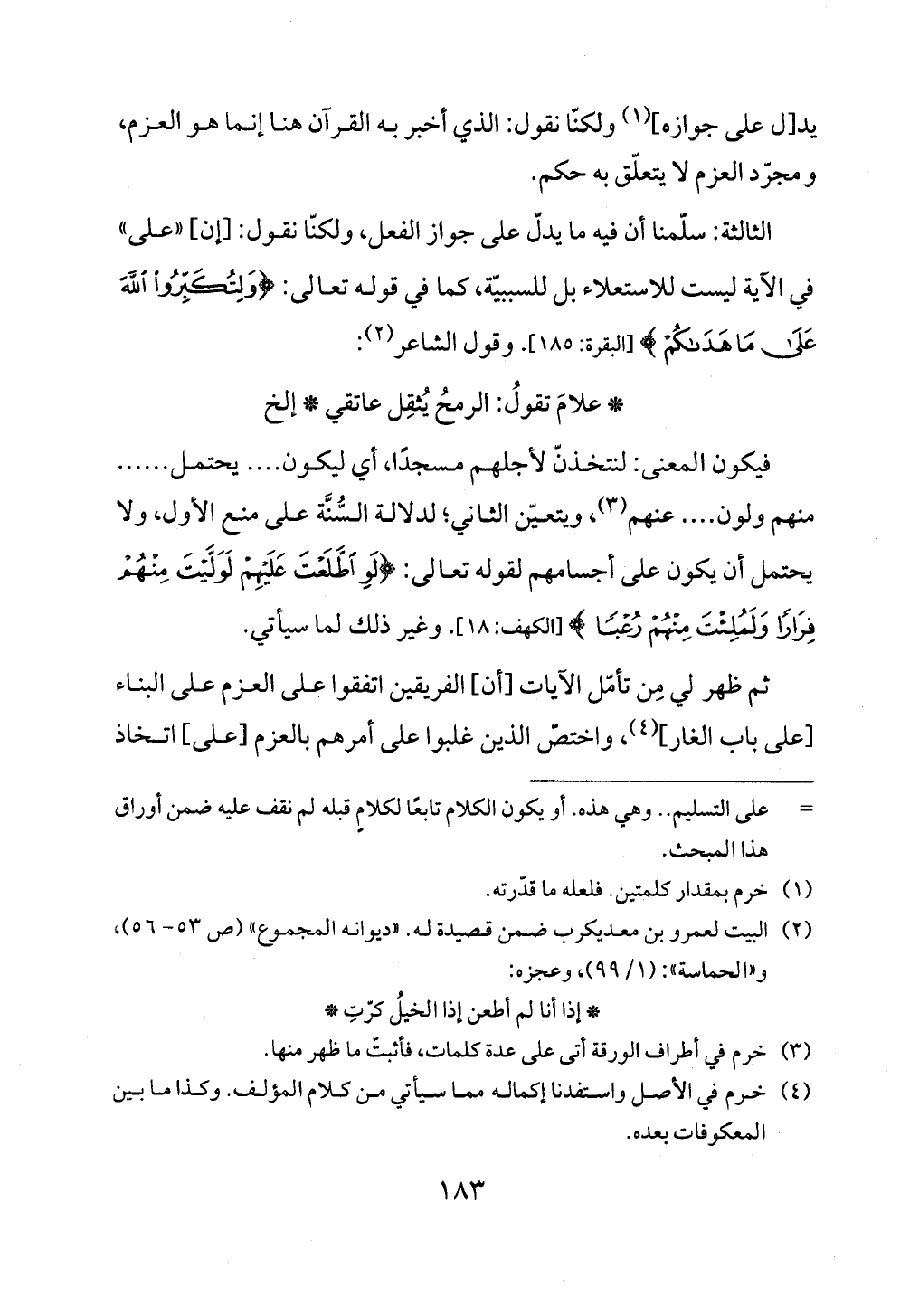 الثالثة: سلّمنا أن فيه ما يدلّ على جواز الفعل، ولكنّا نقول: [إن] «على» في الآية ليست للاستعلاء بل للسببيّة، كما في قوله تعالى: {وَلِتُكَبِّرُوا اللَّهَ عَلَى مَا هَدَاكُمْ} [البقرة: ١٨٥]. وقول الشاعر (¬٢):