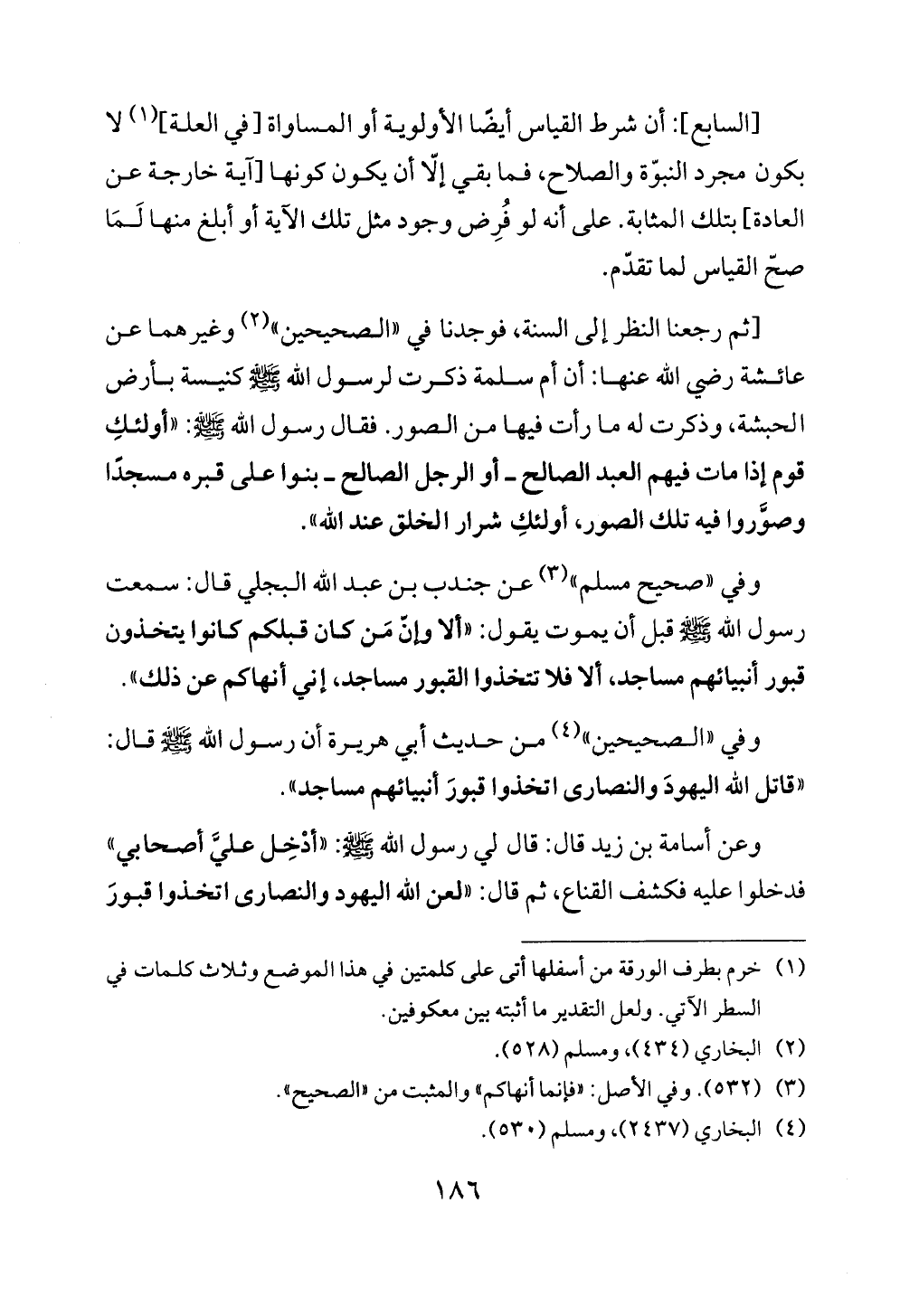 [ثم رجعنا النظر إلى السنة، فوجدنا في «الصحيحين» (¬٢) وغيرهما عن عائشة رضي الله عنها: أن أم سلمة ذكرت لرسول الله - صلى الله عليه وسلم - كنيسة بأرض الحبشة، وذكرت له ما رأت فيها من الصور. فقال رسول الله - صلى الله عليه وسلم -: «أولئكِ قوم إذا مات فيهم العبد الصالح ــ أو الرجل الصالح ــ بنوا على قبره مسجدًا وصوَّروا فيه تلك الصور، أولئكِ شرار الخلق عند الله».