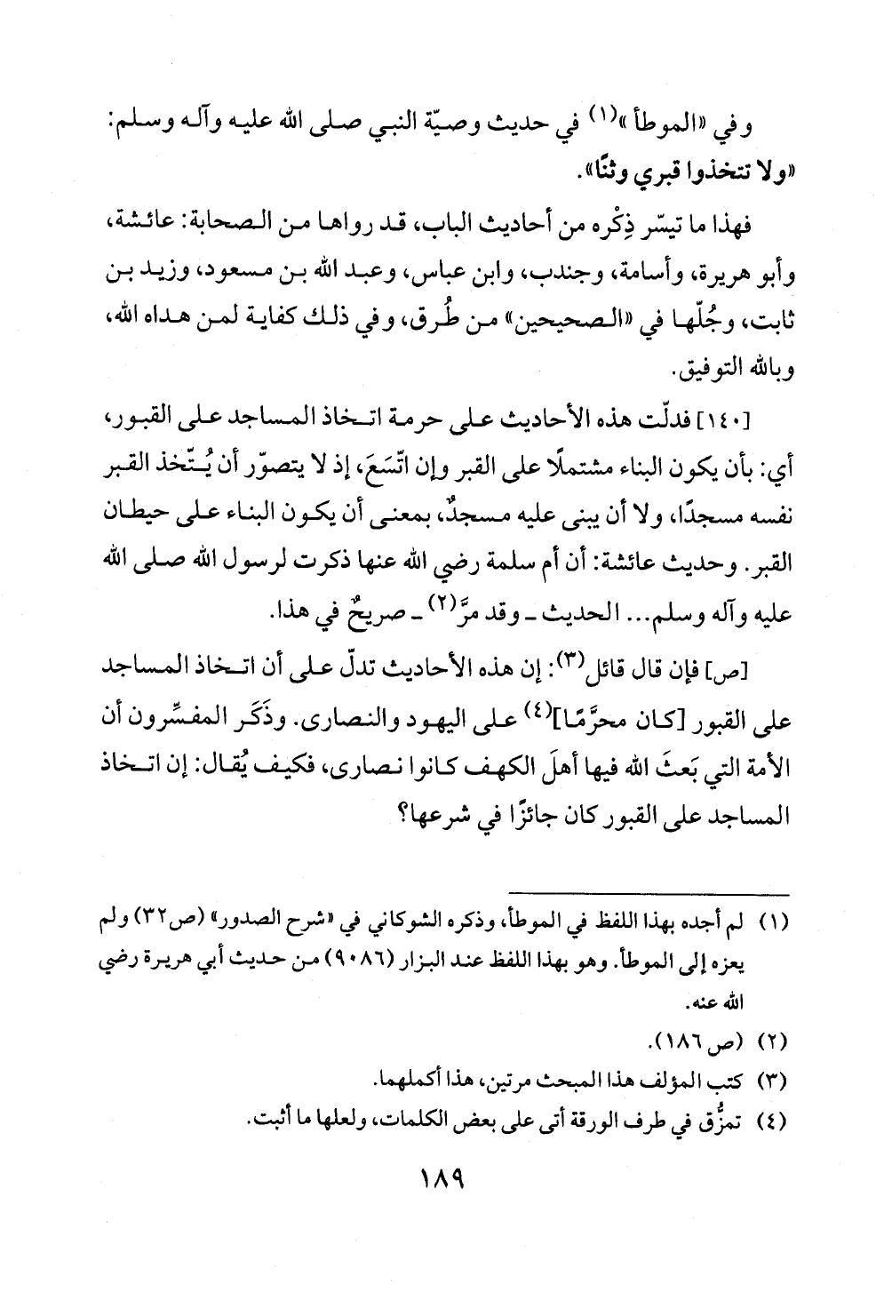 [١٤٠] فدلّت هذه الأحاديث على حرمة اتخاذ المساجد على القبور، أي: بأن يكون البناء مشتملًا على القبر وإن اتّسَعَ، إذ لا يتصوّر أن يُتّخذ القبر نفسه مسجدًا، ولا أن يبنى عليه مسجدٌ، بمعنى أن يكون البناء على حيطان القبر. وحديث عائشة: أن أم سلمة رضي الله عنها ذكرت لرسول الله صلى الله عليه وآله وسلم ... الحديث ــ وقد مرَّ (¬٢) ــ صريحٌ في هذا.