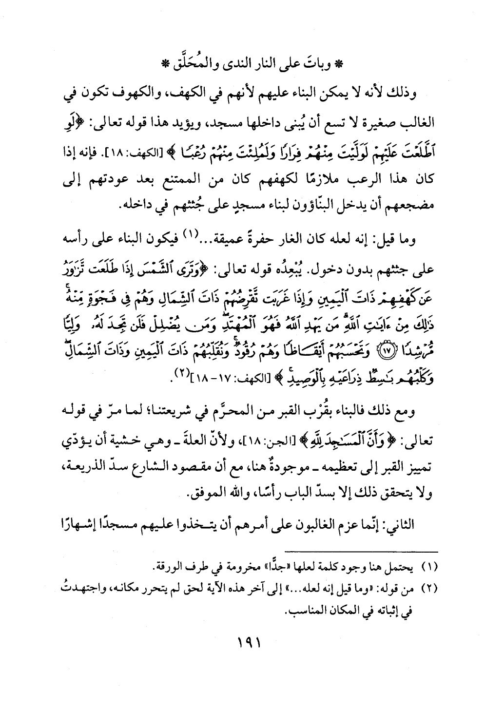 وما قيل: إنه لعله كان الغار حفرةً عميقة ... (¬١) فيكون البناء على رأسه على جثثهم بدون دخول. يُبْعِدُه قوله تعالى: {وَتَرَى الشَّمْسَ إِذَا طَلَعَتْ تَزَاوَرُ عَنْ كَهْفِهِمْ ذَاتَ الْيَمِينِ وَإِذَا غَرَبَتْ تَقْرِضُهُمْ ذَاتَ الشِّمَالِ وَهُمْ فِي فَجْوَةٍ مِنْهُ ذَلِكَ مِنْ آيَاتِ اللَّهِ مَنْ يَهْدِ اللَّهُ فَهُوَ الْمُهْتَدِ وَمَنْ يُضْلِلْ فَلَنْ تَجِدَ لَهُ وَلِيًّا مُرْشِدًا (١٧) وَتَحْسَبُهُمْ أَيْقَاظًا وَهُمْ رُقُودٌ وَنُقَلِّبُهُمْ ذَاتَ الْيَمِينِ وَذَاتَ الشِّمَالِ وَكَلْبُهُمْ بَاسِطٌ ذِرَاعَيْهِ بِالْوَصِيدِ} [الكهف: ١٧ - ١٨] (¬٢).