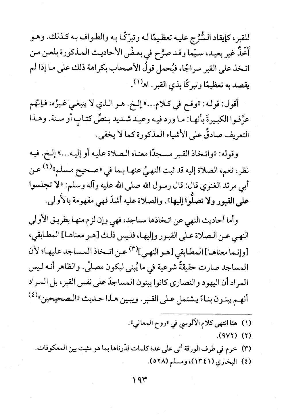 للقبر، كإيقاد السُّرُج عليه تعظيمًا له وتبرّكًا به والطواف به كذلك. وهو أَخْذٌ غير بعيد، سيّما وقد صرَّح في بعضُ الأحاديث المذكورة بلعن من اتخذ على القبر سراجًا، فيُحمل قولُ الأصحاب بكراهة ذلك على ما إذا لم يقصد به تعظيمًا وتبركًا بذي القبر. ا? (¬١).