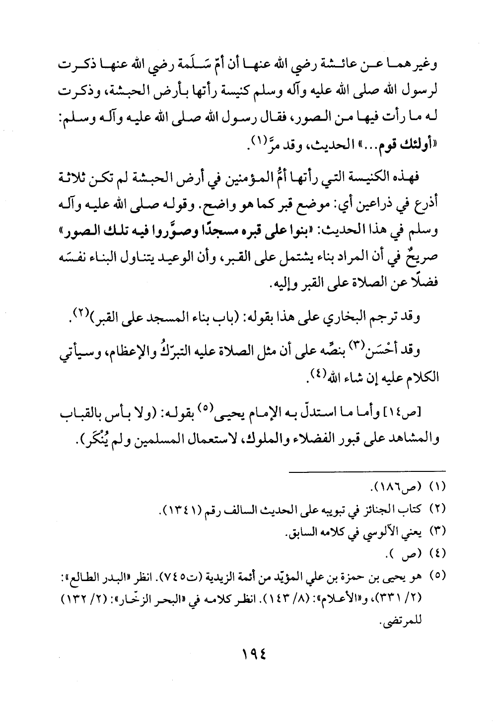 فهذه الكنيسة التي رأتها أمُّ المؤمنين في أرض الحبشة لم تكن ثلاثة أذرع في ذراعين أي: موضع قبر كما هو واضح. وقوله صلى الله عليه وآله وسلم في هذا الحديث: «بنوا على قبره مسجدًا وصوَّروا فيه تلك الصور» صريحٌ في أن المراد بناء يشتمل على القبر، وأن الوعيد يتناول البناء نفسَه فضلًا عن الصلاة على القبر وإليه.