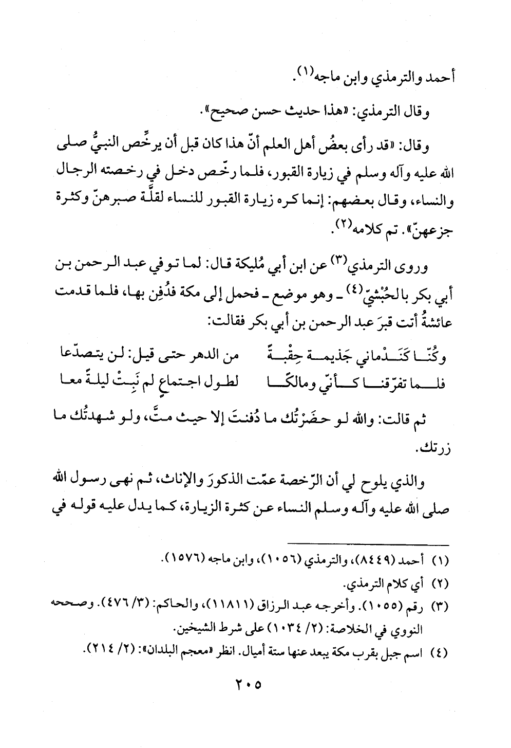 وقال: «قد رأى بعضُ أهل العلم أنّ هذا كان قبل أن يرخِّص النبيُّ صلى الله عليه وآله وسلم في زيارة القبور، فلما رخّص دخل في رخصته الرجال والنساء، وقال بعضهم: إنما كره زيارة القبور للنساء لقلَّة صبرهنّ وكثرة جزعهنّ». تم كلامه (¬٢).