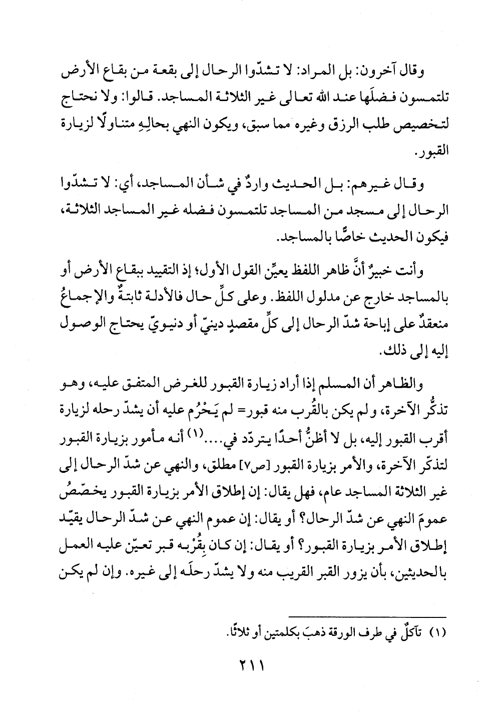 وأنت خبيرٌ أنَّ ظاهر اللفظ يعيِّن القول الأول؛ إذ التقييد ببقاع الأرض أو بالمساجد خارج عن مدلول اللفظ. وعلى كلِّ حال فالأدلة ثابتةٌ والإجماعُ منعقدٌ على إباحة شدّ الرحال إلى كلِّ مقصدٍ دينيّ أو دنيويّ يحتاج الوصول إليه إلى ذلك.