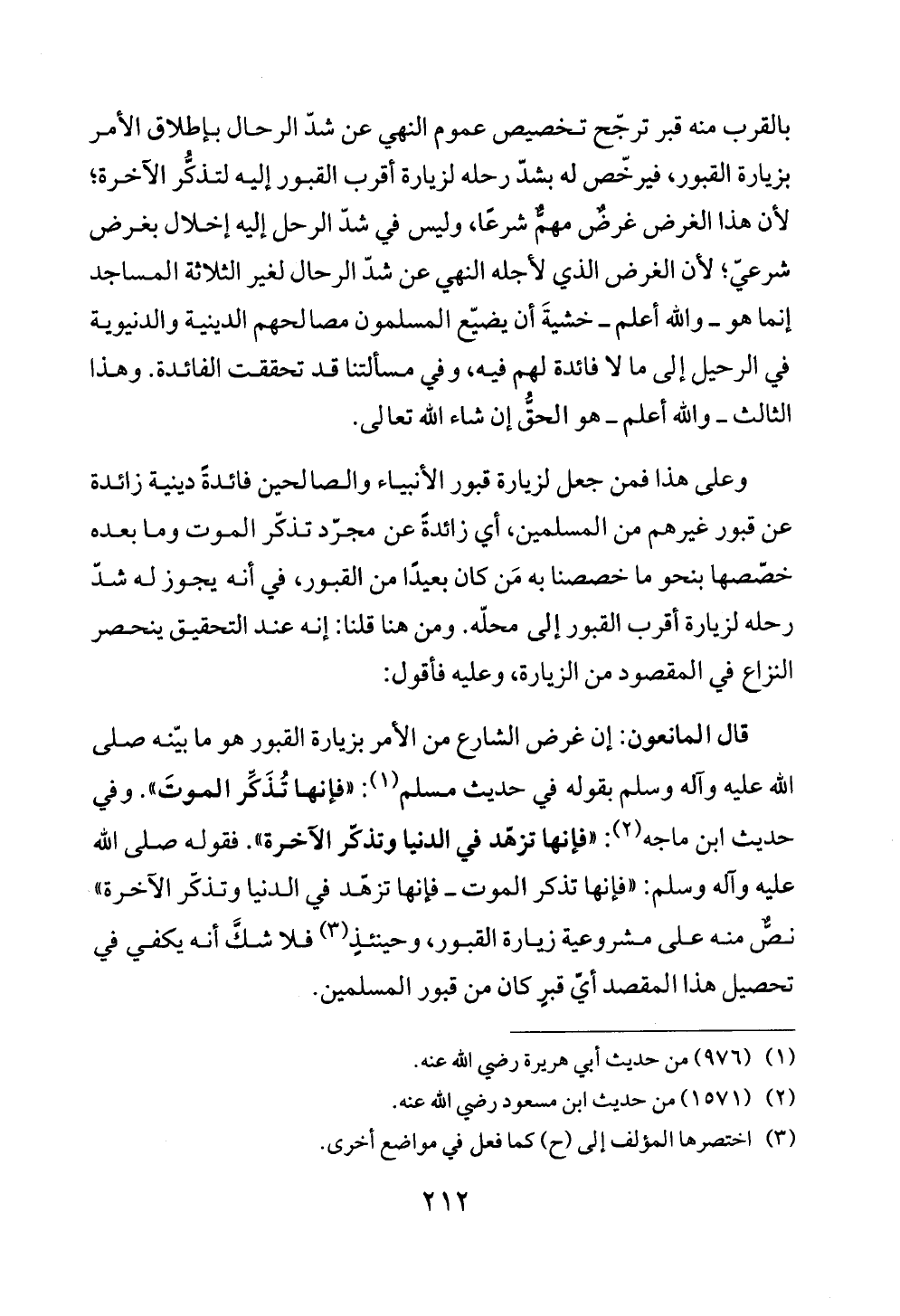 قال المانعون: إن غرض الشارع من الأمر بزيارة القبور هو ما بيّنه صلى الله عليه وآله وسلم بقوله في حديث مسلم (¬١): «فإنها تُذَكِّر الموتَ». وفي حديث ابن ماجه (¬٢): «فإنها تزهّد في الدنيا وتذكّر الآخرة». فقوله صلى الله عليه وآله وسلم: «فإنها تذكر الموت ــ فإنها تزهّد في الدنيا وتذكّر الآخرة» نصٌّ منه على مشروعية زيارة القبور، وحينئذٍ (¬٣) فلا شكَّ أنه يكفي في تحصيل هذا المقصد أيّ قبرٍ كان من قبور المسلمين.