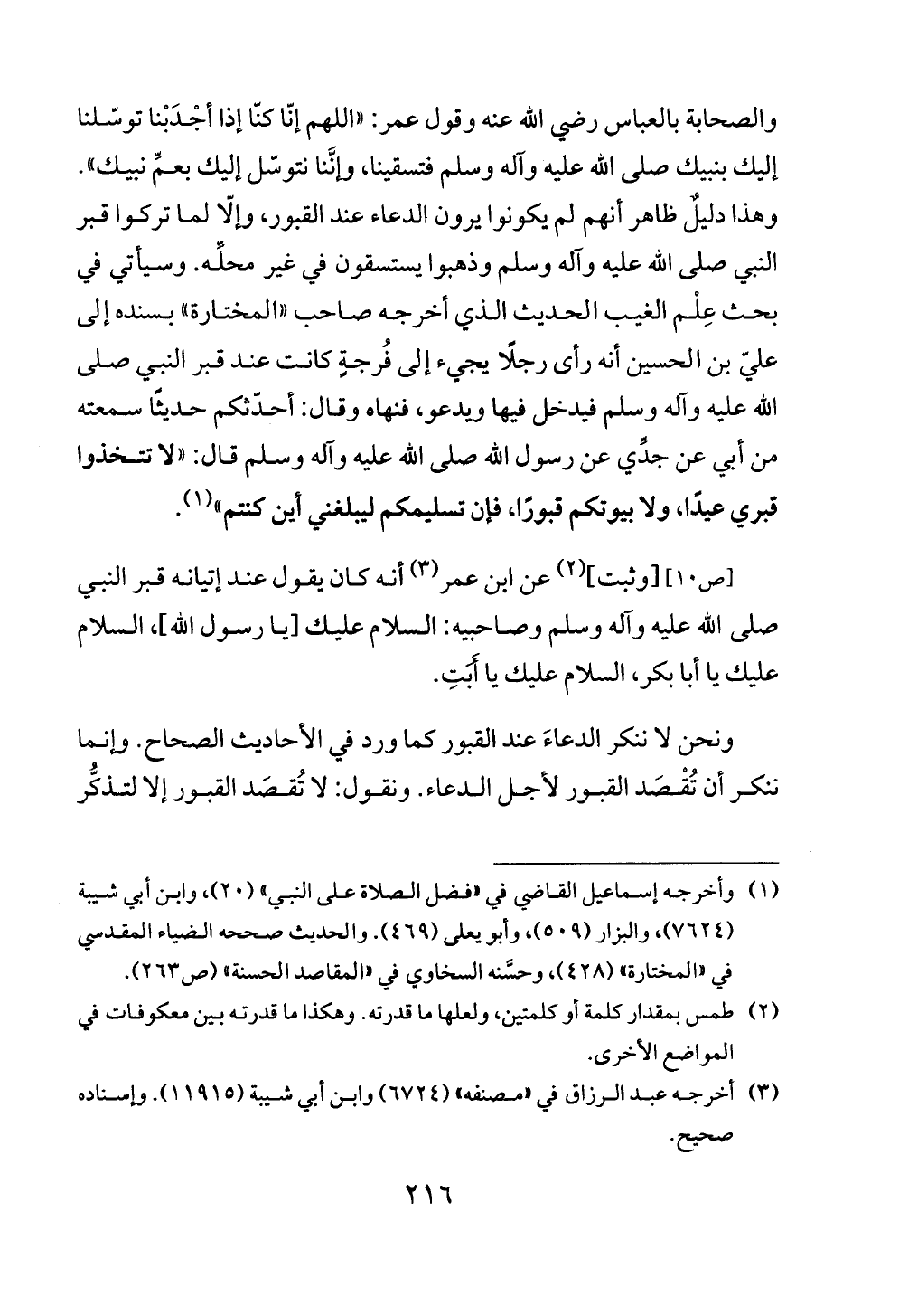 والصحابة بالعباس رضي الله عنه وقول عمر: «اللهم إنّا كنّا إذا أجْدَبْنا توسّلنا إليك بنبيك صلى الله عليه وآله وسلم فتسقينا، وإنَّنا نتوسّل إليك بعمِّ نبيك». وهذا دليلٌ ظاهر أنهم لم يكونوا يرون الدعاء عند القبور، وإلّا لما تركوا قبر النبي صلى الله عليه وآله وسلم وذهبوا يستسقون في غير محلِّه. وسيأتي في بحث عِلْم الغيب الحديث الذي أخرجه صاحب «المختارة» بسنده إلى عليّ بن الحسين أنه رأى رجلًا يجيء إلى فُرجةٍ كانت عند قبر النبي صلى الله عليه وآله وسلم فيدخل فيها ويدعو، فنهاه وقال: أحدّثكم حديثًا سمعته من أبي عن جدِّي عن رسول الله صلى الله عليه وآله وسلم قال: «لا تتخذوا قبري عيدًا، ولا بيوتكم قبورًا، فإن تسليمكم ليبلغني أين كنتم» (¬١).