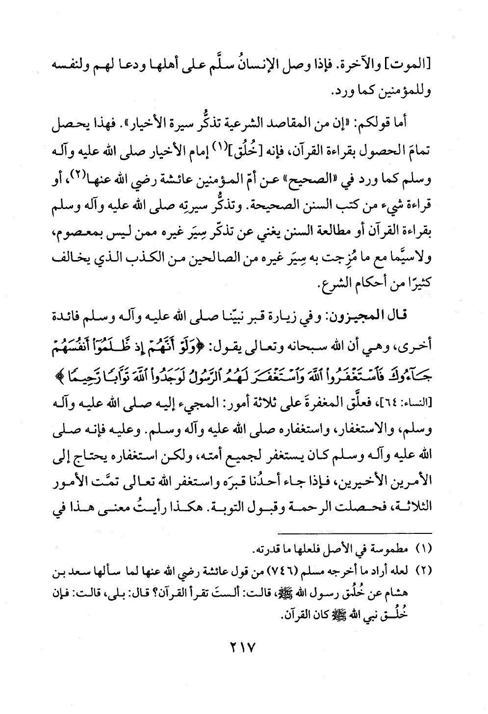 قال المجيزون: وفي زيارة قبر نبيّنا صلى الله عليه وآله وسلم فائدة أخرى، وهي أن الله سبحانه وتعالى يقول: {وَلَوْ أَنَّهُمْ إِذْ ظَلَمُوا أَنْفُسَهُمْ جَاءُوكَ فَاسْتَغْفَرُوا اللَّهَ وَاسْتَغْفَرَ لَهُمُ الرَّسُولُ لَوَجَدُوا اللَّهَ تَوَّابًا رَحِيمًا} [النساء: ٦٤]، فعلَّق المغفرةَ على ثلاثة أمور: المجيء إليه صلى الله عليه وآله وسلم، والاستغفار، واستغفاره صلى الله عليه وآله وسلم. وعليه فإنه صلى الله عليه وآله وسلم كان يستغفر لجميع أمته، ولكن استغفاره يحتاج إلى الأمرين الأخيرين، فإذا جاء أحدُنا قبرَه واستغفر الله تعالى تمَّت الأمور الثلاثة، فحصلت الرحمة وقبول التوبة. هكذا رأيتُ معنى هذا في