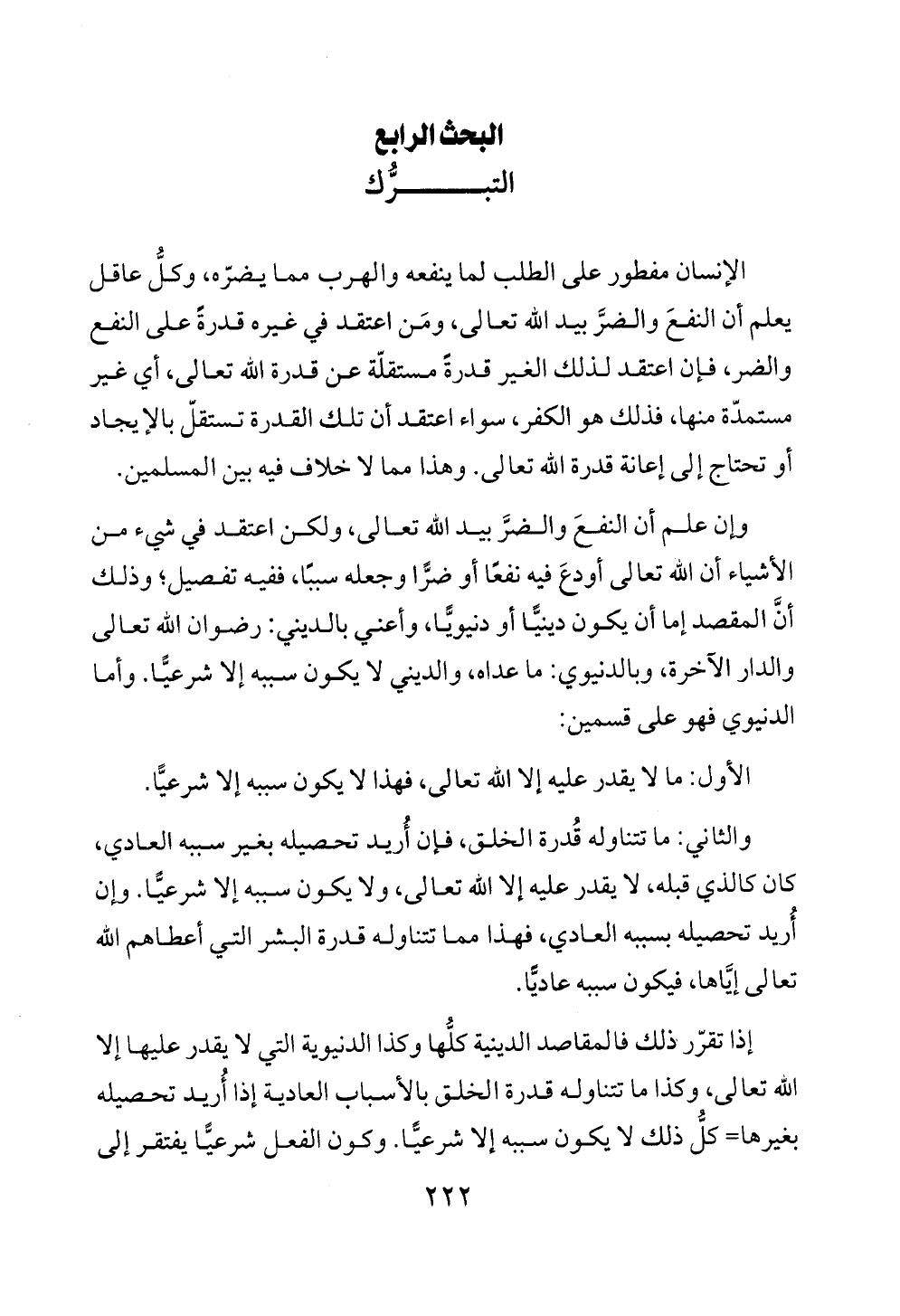 والثاني: ما تتناوله قُدرة الخلق، فإن أُريد تحصيله بغير سببه العادي، كان كالذي قبله، لا يقدر عليه إلا الله تعالى، ولا يكون سببه إلا شرعيًّا. وإن أُريد تحصيله بسببه العادي، فهذا مما تتناوله قدرة البشر التي أعطاهم الله تعالى إيَّاها، فيكون سببه عاديًّا.