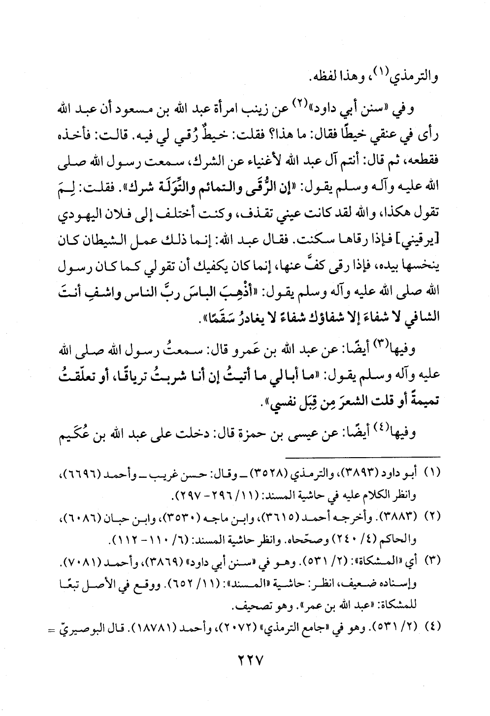 وفي «سنن أبي داود» (¬٢) عن زينب امرأة عبد الله بن مسعود أن عبد الله رأى في عنقي خيطًا فقال: ما هذا؟ فقلت: خيطٌ رُقي لي فيه. قالت: فأخذه فقطعه، ثم قال: أنتم آل عبد الله لأغنياء عن الشرك، سمعت رسول الله صلى الله عليه وآله وسلم يقول: «إن الرُّقَى والتمائم والتِّوَلَة شرك». فقلت: لِمَ تقول هكذا، والله لقد كانت عيني تقذف، وكنت أختلف إلى فلان اليهودي [يرقيني] فإذا رقاها سكنت. فقال عبد الله: إنما ذلك عمل الشيطان كان ينخسها بيده، فإذا رقى كفَّ عنها، إنما كان يكفيك أن تقولي كما كان رسول الله صلى الله عليه وآله وسلم يقول: «أذْهِبَ الباسَ ربَّ الناس واشفِ أنتَ الشافي لا شفاءَ إلا شفاؤك شفاءً لا يغادرُ سَقَمًا».