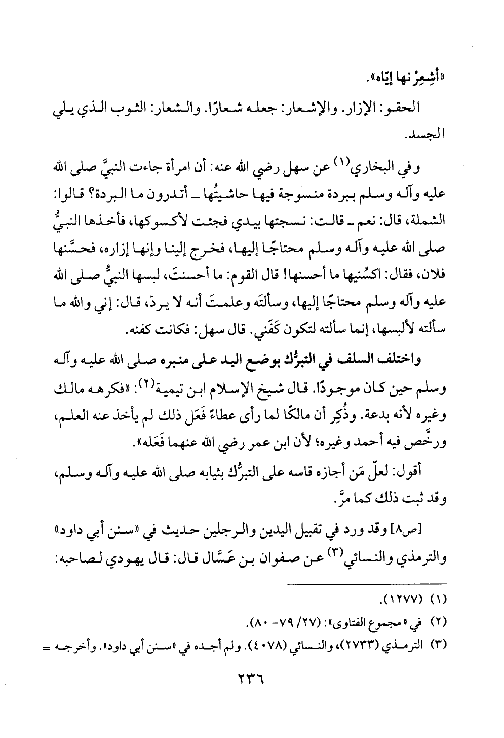 وفي البخاري (¬١) عن سهل رضي الله عنه: أن امرأة جاءت النبيَّ صلى الله عليه وآله وسلم ببردة منسوجة فيها حاشيتُها ــ أتدرون ما البردة؟ قالوا: الشملة، قال: نعم ــ قالت: نسجتها بيدي فجئت لأكسوكها، فأخذها النبيُّ صلى الله عليه وآله وسلم محتاجًا إليها، فخرج إلينا وإنها إزاره، فحسَّنها فلان، فقال: اكسُنيها ما أحسنها! قال القوم: ما أحسنتَ، لبسها النبيُّ صلى الله عليه وآله وسلم محتاجًا إليها، وسألتَه وعلمتَ أنه لا يردّ، قال: إني والله ما سألته لألبسها، إنما سألته لتكون كَفَني. قال سهل: فكانت كفنه.