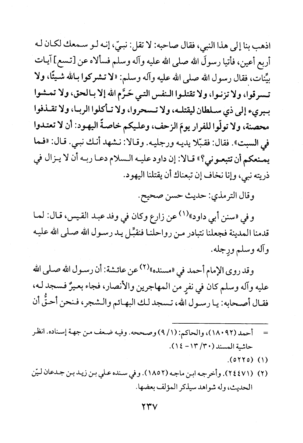 اذهب بنا إلى هذا النبي، فقال صاحبه: لا تقل: نبيّ، إنه لو سمعك لكان له أربع أعين، فأتيا رسولَ الله صلى الله عليه وآله وسلم فسألاه عن [تسع] آيات بيِّنات، فقال رسول الله صلى الله عليه وآله وسلم: «لا تشركوا بالله شيئًا، ولا تسرقوا، ولا تزنوا، ولا تقتلوا النفس التي حَرَّم الله إلا بالحق، ولا تمشوا ببريء إلى ذي سلطان ليقتله، ولا تسحروا، ولا تأكلوا الربا، ولا تقذفوا محصنة، ولا تولّوا للفرار يومَ الزحف، وعليكم خاصةً اليهود: أن لا تعتدوا في السبت». فقال: فقبّلا يديه ورجليه. وقالا: نشهد أنك نبي. قال: «فما يمنعكم أن تتبعوني؟ » قالا: إن داود عليه السلام دعا ربه أن لا يزال في ذريته نبي، وإنا نخاف إن تبعناك أن يقتلنا اليهود.