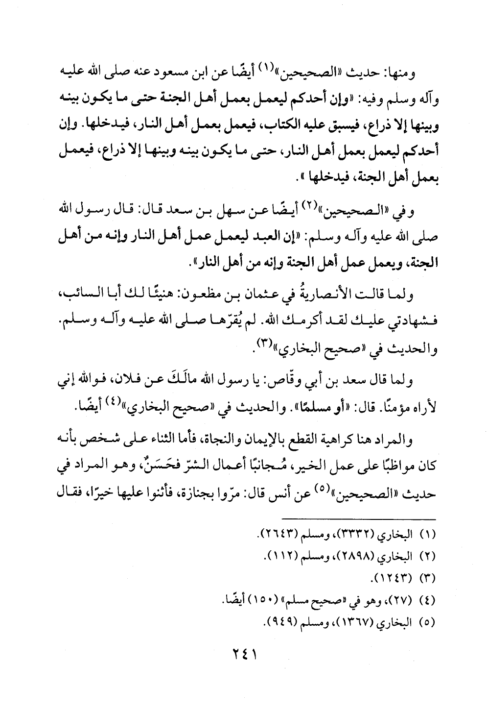 ومنها: حديث «الصحيحين» (¬١) أيضًا عن ابن مسعود عنه صلى الله عليه وآله وسلم وفيه: «وإن أحدكم ليعمل بعمل أهل الجنة حتى ما يكون بينه وبينها إلا ذراع، فيسبق عليه الكتاب، فيعمل بعمل أهل النار، فيدخلها. وإن أحدكم ليعمل بعمل أهل النار، حتى ما يكون بينه وبينها إلا ذراع، فيعمل بعمل أهل الجنة، فيدخلها».